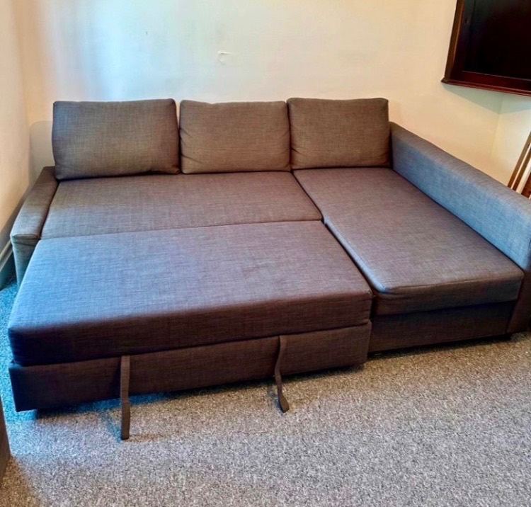 Grey IKEA FRIHETEN corner sofa bed with ottoman storage.