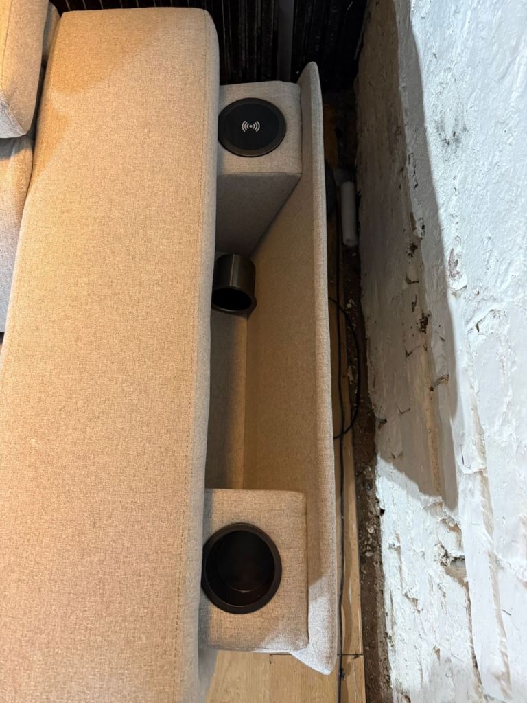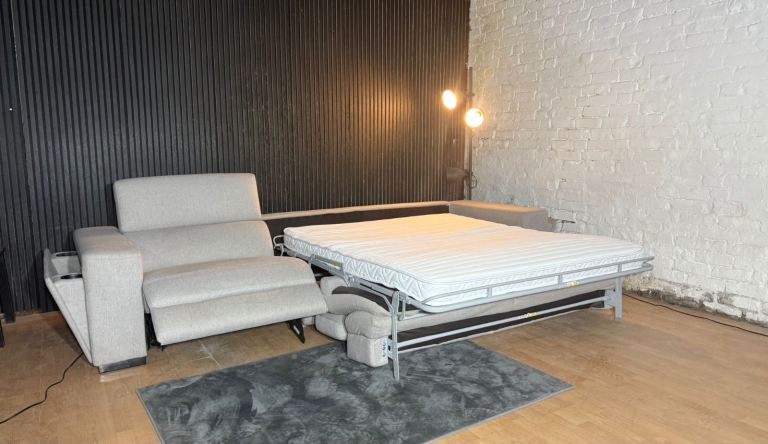 This sofa comes with a power electric recliner seat, built-in cup holders, wireless charging ports, and adjustable headrests for maximum comfort. It also converts into a sofa bed, making it ideal for guests.