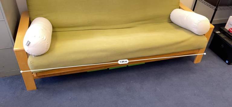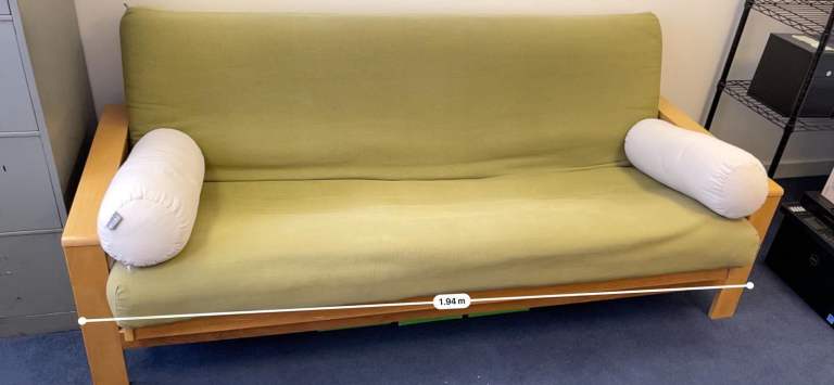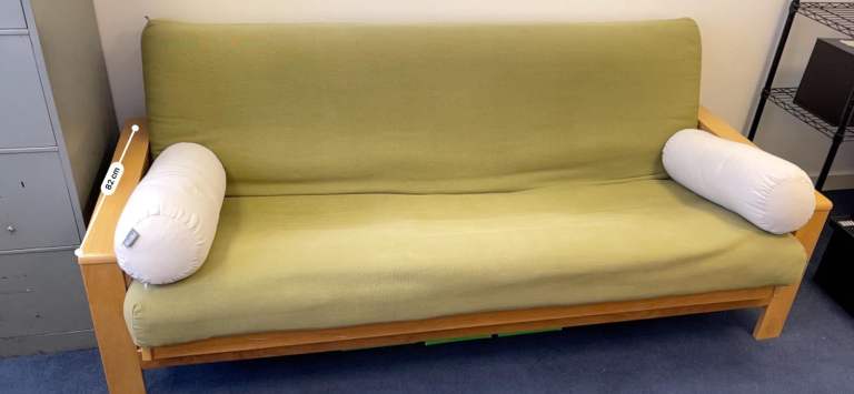 Sturdy wooden frame. Mattress is ok, but could be replaced/recovered. Bolster cushions available too.