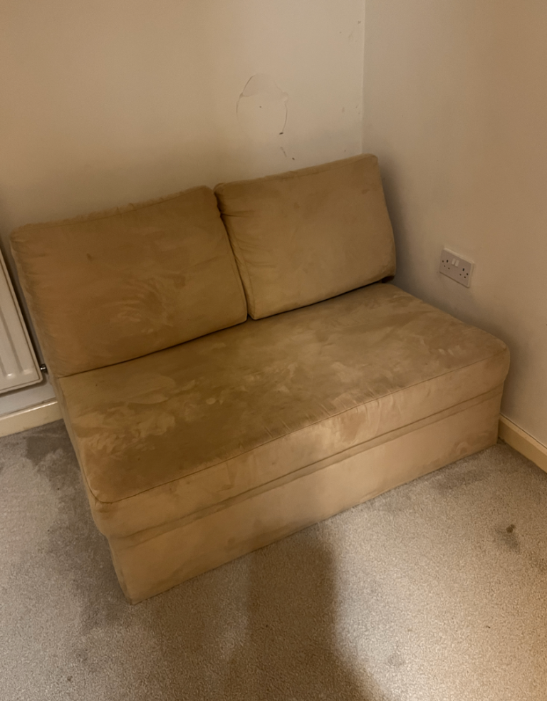 Well used but still got life in it. Sofa has few small marks but they would wash out and when open the bed section has small tear in it shown in pics.