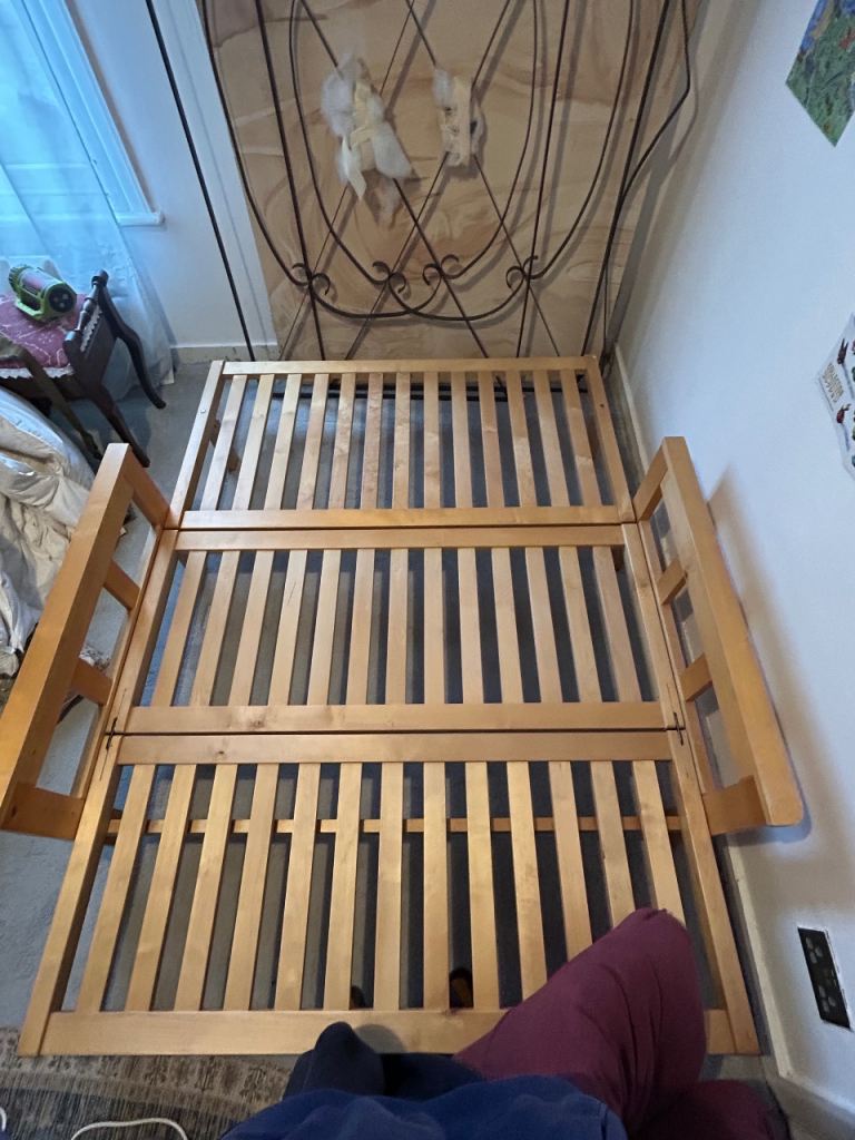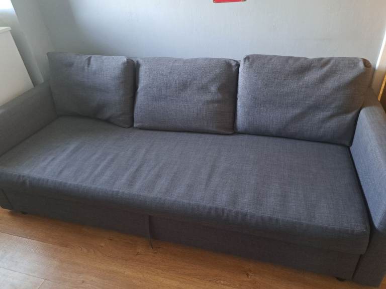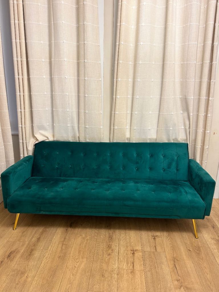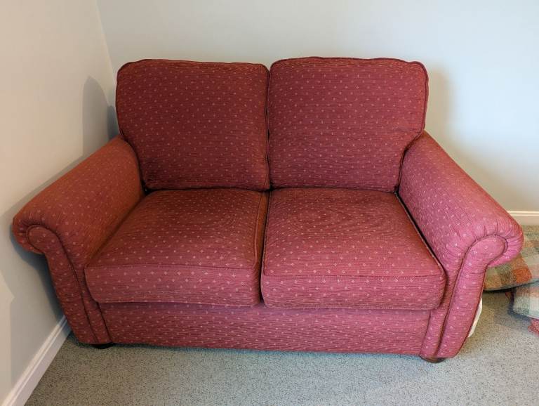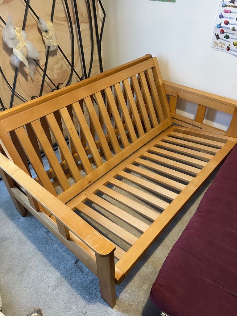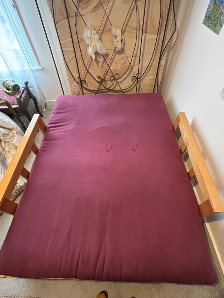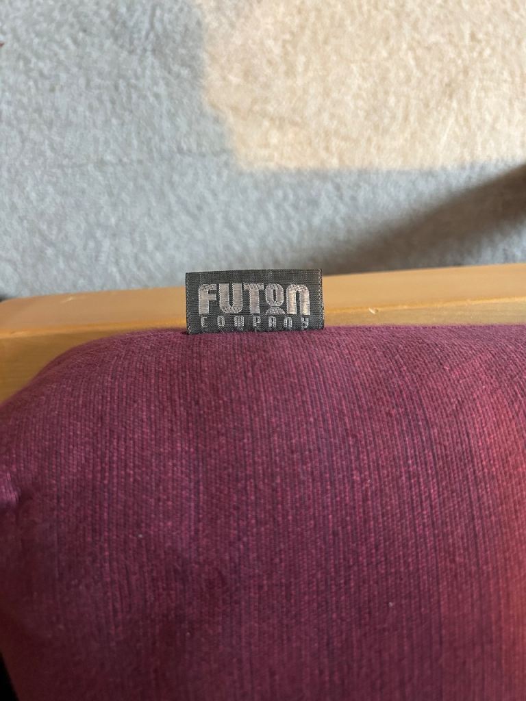 Really good heavy duty Futon by Futon Company with mattress and mattress cover. Used but still has loads of life in. Functions perfectly. Marks on the mattress cover are from dye we used to dyeing it red. Mattress cover can be taken off. COLLECTION ONLY from SE22.
