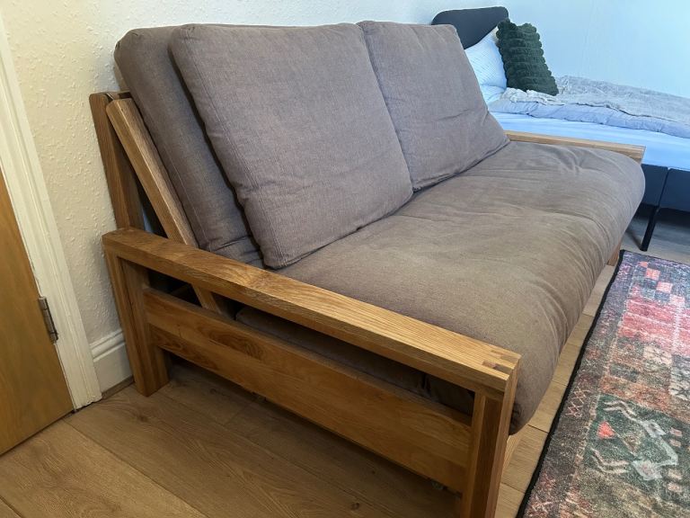 Selling a Futon Company Quad birch sofa bed in good condition. Includes the matching underbed storage drawer and 2 extra cushions.