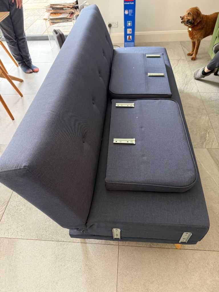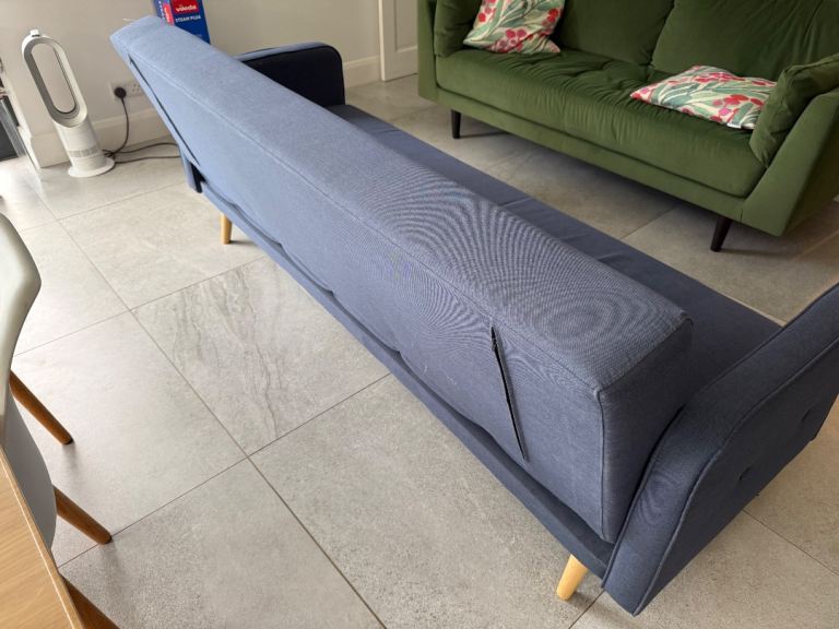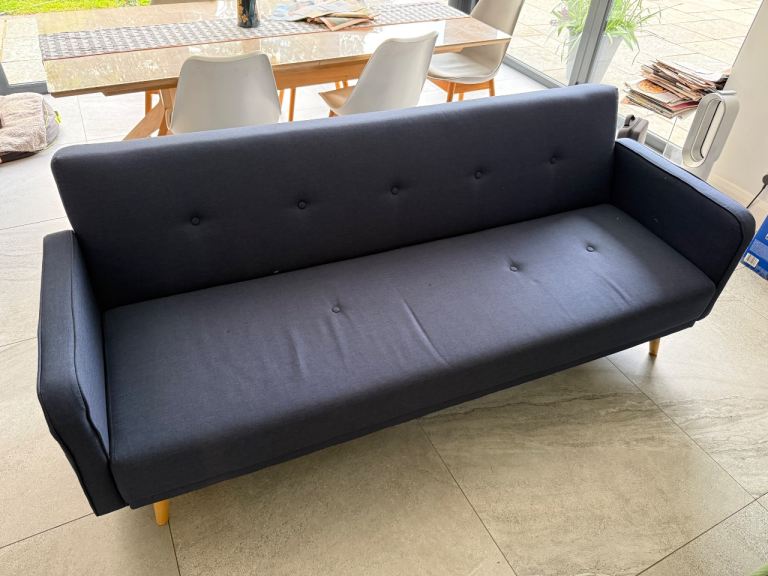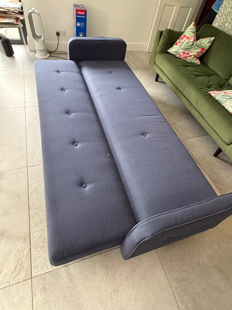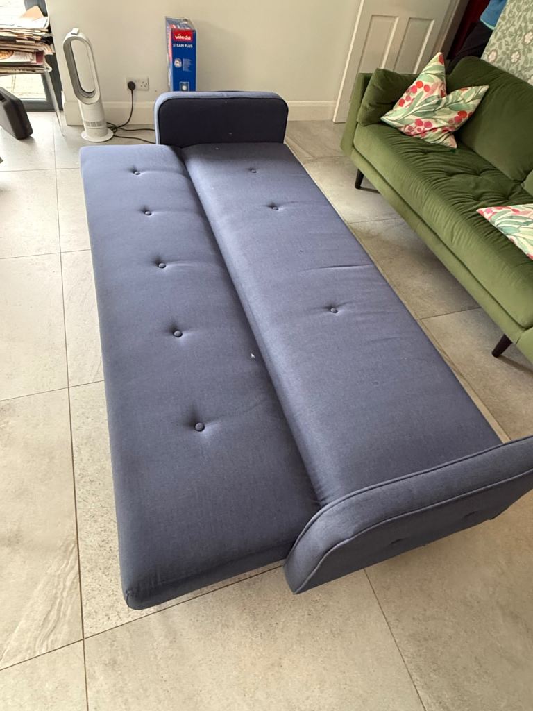 Grey / Blue sofa bed in good condition 203 cm long / 108 cm wide when folded out , when not in use bed legs zip into back of sofa , detachable arm rests