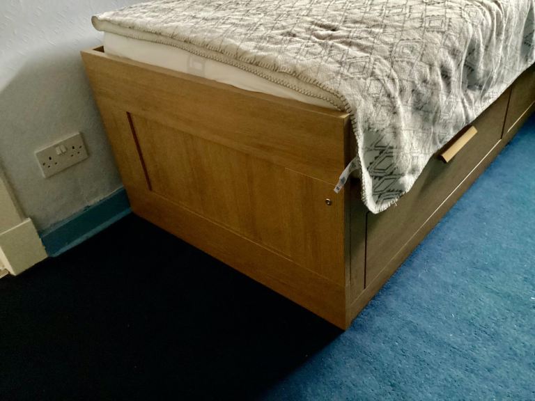 Oak effect IKEA Brimnes day bed with 2 mattresses. Still available new from IKEA but in white only. Can be used as a single bed or pulled out to give a king size bed. Two large storage drawers. Great and adaptable as a guest bed. In new condition and only been used on a couple of occasions. No damage. Have copy of assembly manual and tools should some disassembly be required for transport. Must be uplifted and due to long pieces (2m) a van or large vehicle would be required