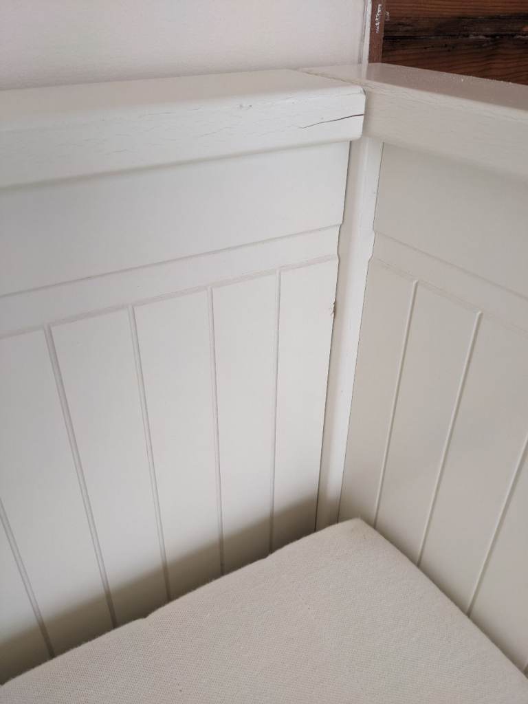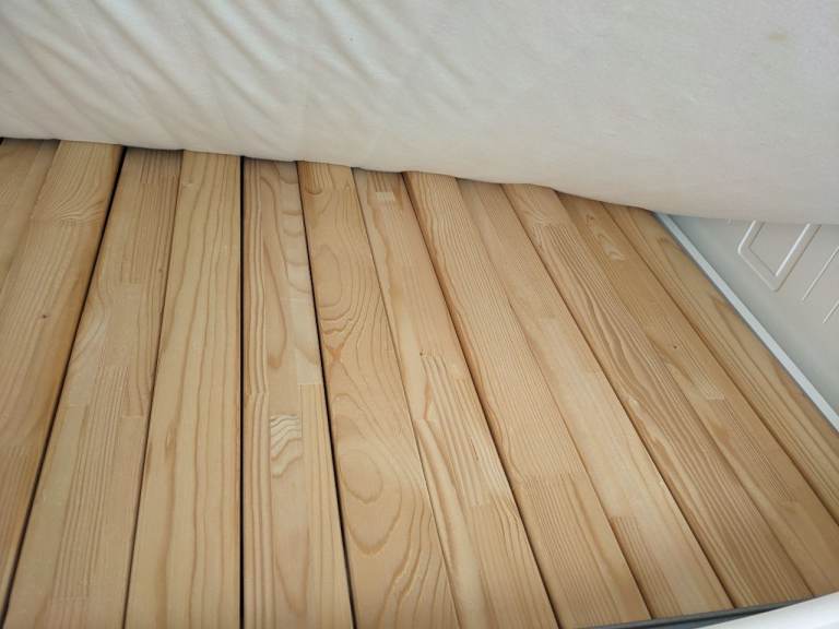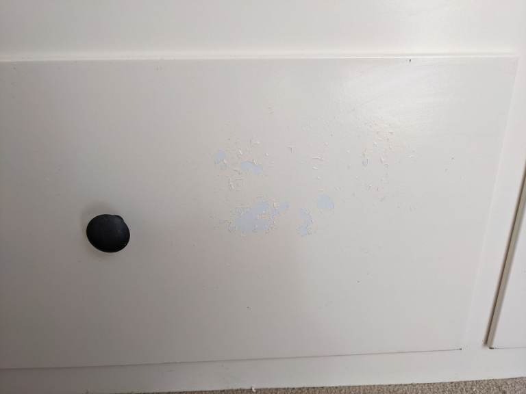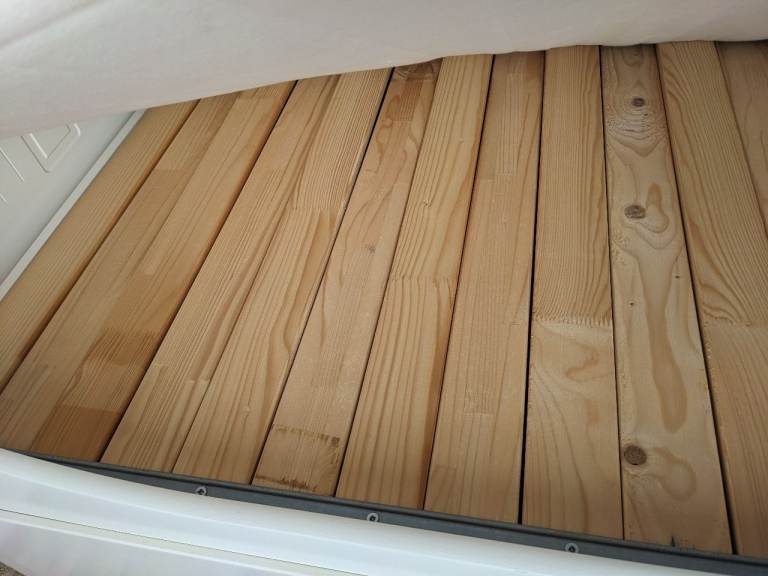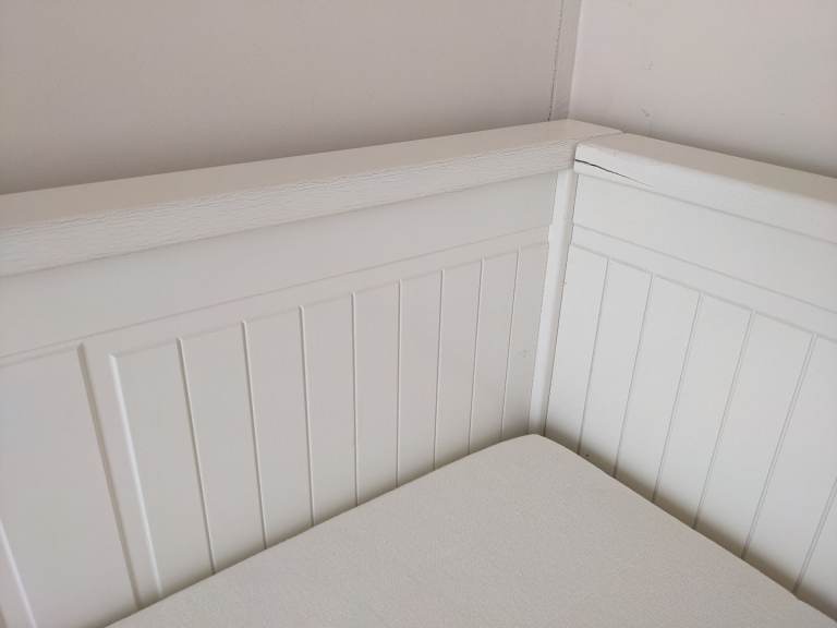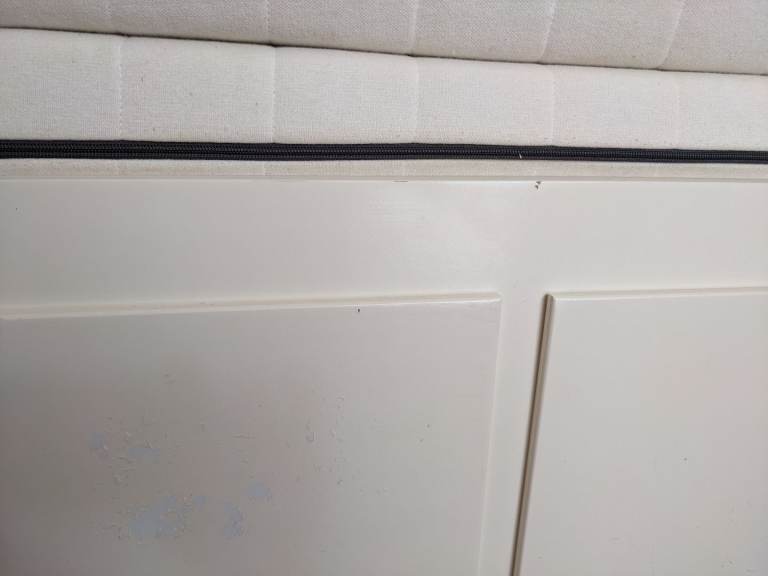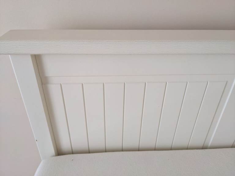 Some minor marks on the paintwork but hardly noticeable and a tiny bit of paint flaking on the front left drawer which could either be touched up but not massively noticeable - just wanting to be transparent that's in not in full immaculate condition but very good nick overall and with cushions on you don't notice much. Photos show all marks. All slats intact and present.