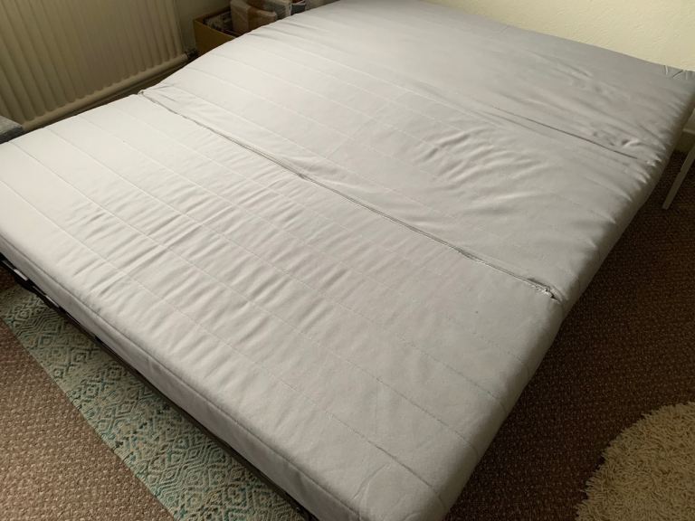 IKEA lycksele double sofa bed, mattress and two covers. Foam mattress with removable, washable cover - super comfortable! Pull out bedframe in standard double size with wooden slats. Two covers included - one grey Ikea quilted cover and a lovely bottle green cover from Cover Couch so you can change up the style.