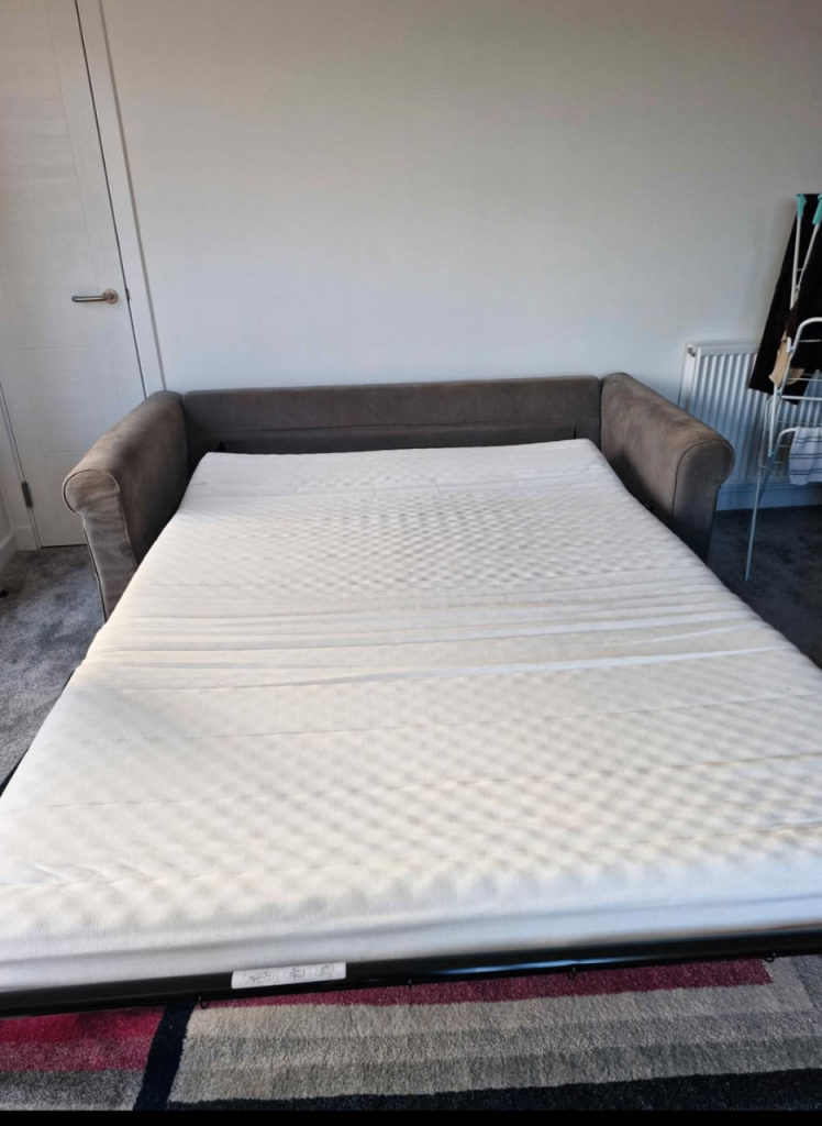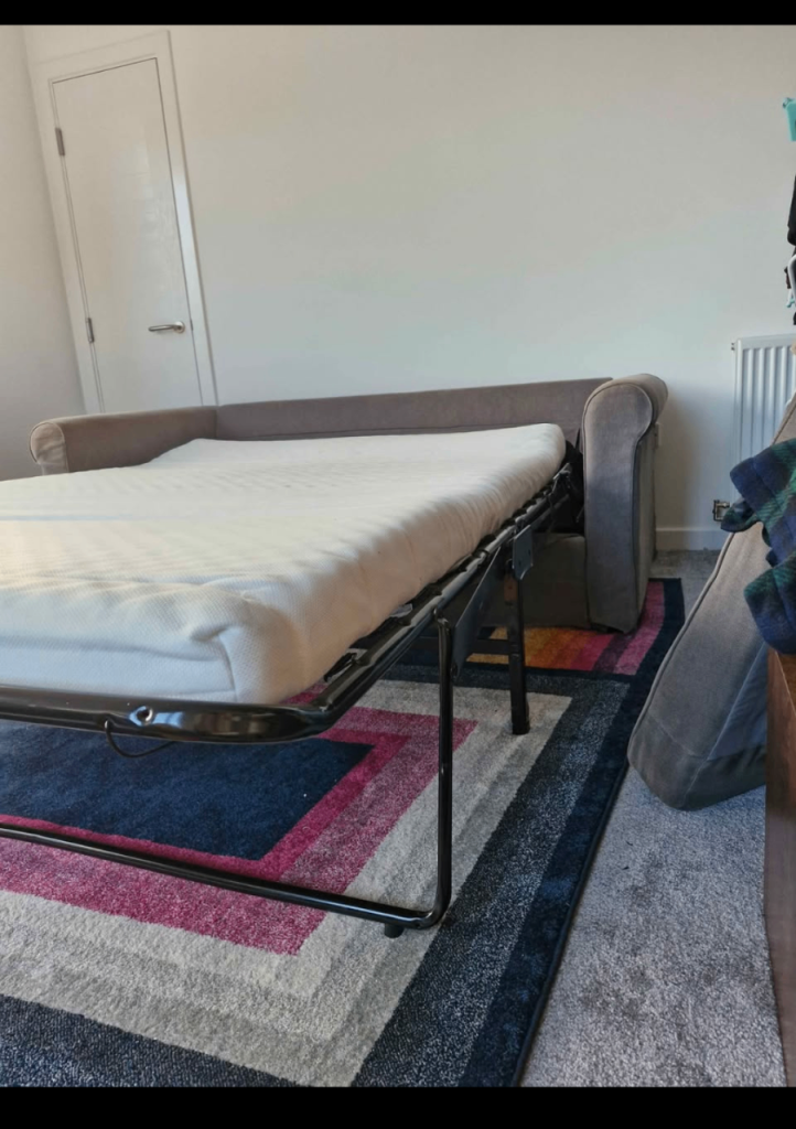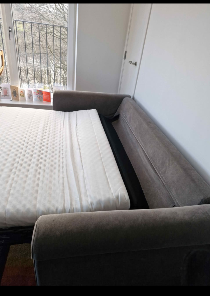 Ikea sofa-bed. Colour is medium grey. Bed is a double and very comfortable.