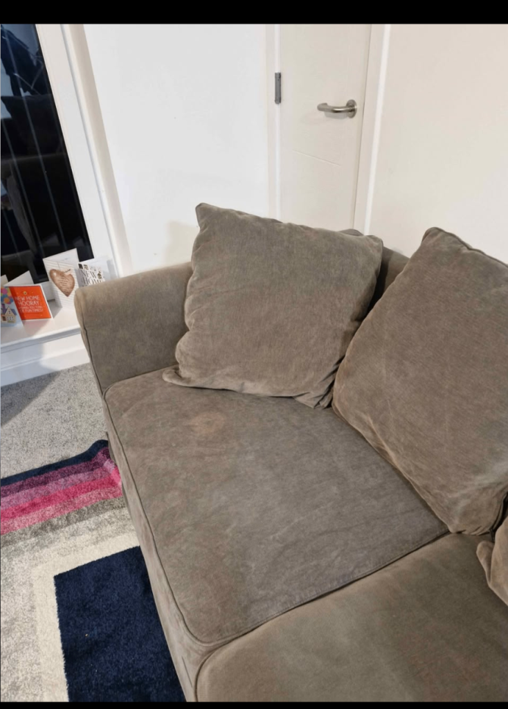 In very good condition, normal wear, only one food stain that has been treated on one of the seat cushions. We are selling it because it doesn't fit well in the space.