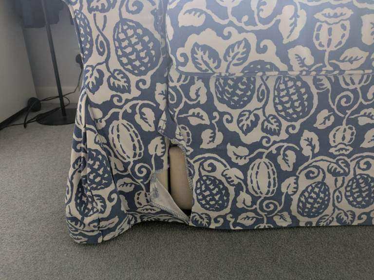 As seen in the fourth photo, there is a slight horizontal tear of about an inch at the base of the main sofa cover. It's not meant to be fully sewn up here (see the intended gap on the other side of the sofa; there is meant to be a vertical gap) but the tear can be repaired with a needle and thread if it bothers you.