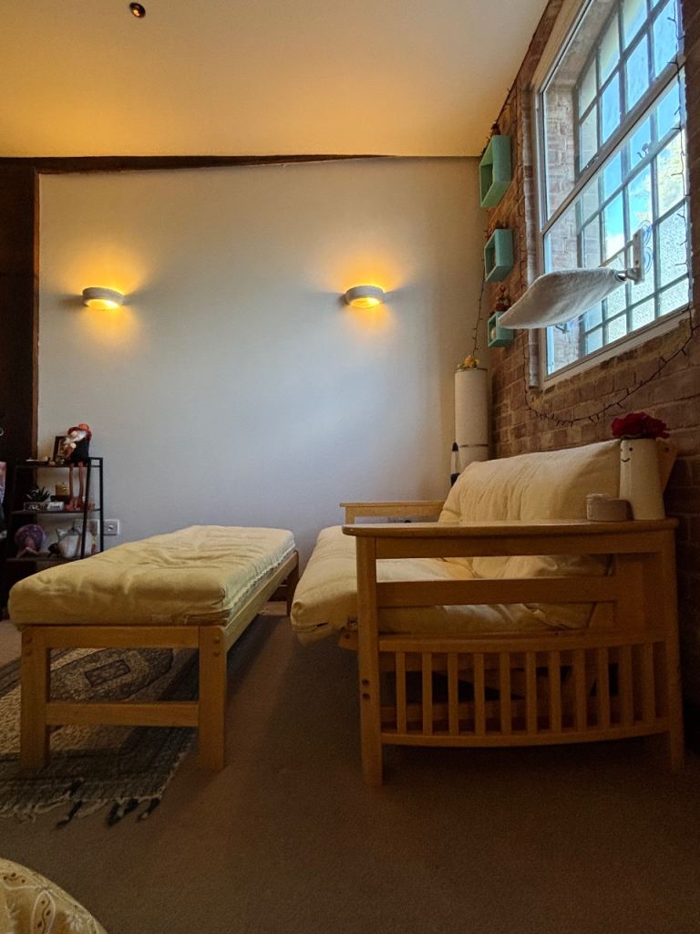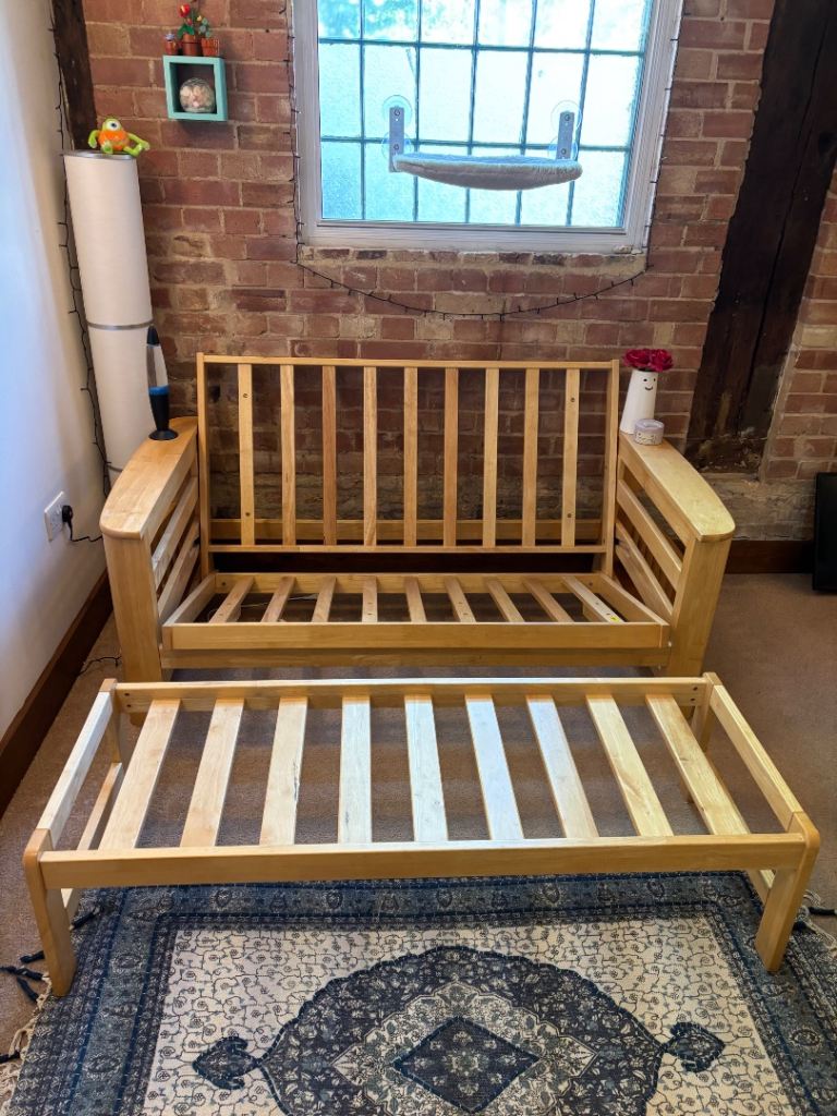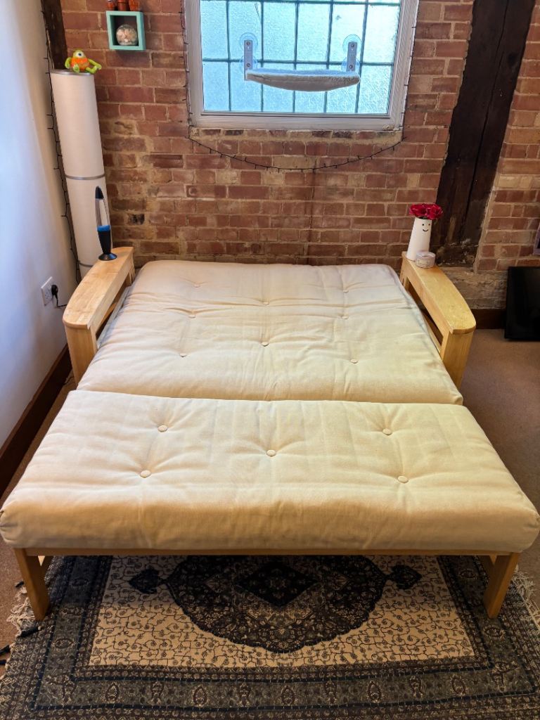 Rare Kyoto futon with footstool in a nice cream color. Have only had for about a year, but selling due to moving and need gone ASAP. Has recently been washed and steamed. Shows very slight worn marks but in overall good condition. Folds out nicely into a double sized bed.