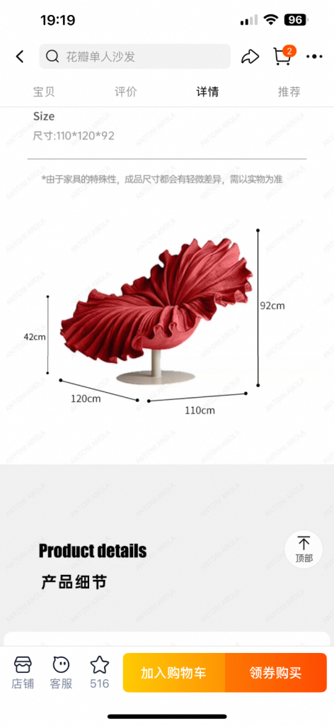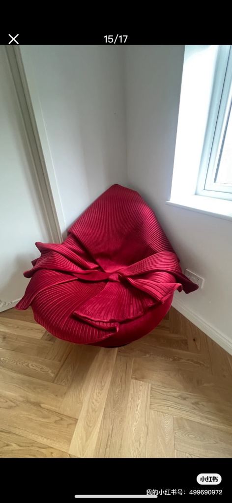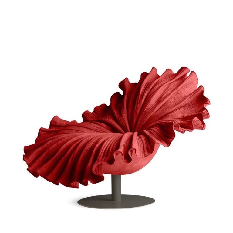 This chair is a striking piece of modern art furniture. Its design resembles a flowing red fabric or a blooming flower, with dramatic ruffled curves that fan outward like petals in motion. The vivid crimson color enhances its sculptural and luxurious look, while the smooth round base provides balance and contrast to the organic, wave-like form. It feels both elegant and bold, blending functionality with artistic expression.