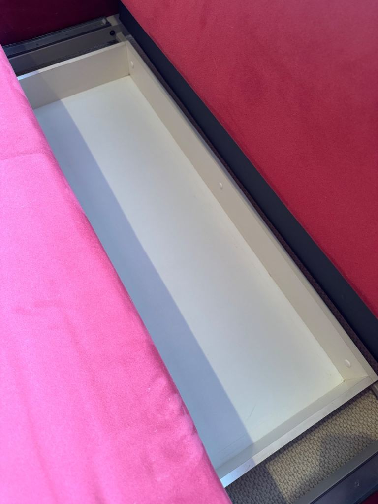 There is a storage space under the sofa which fits bedding and sheets. It also comes with a stool.
