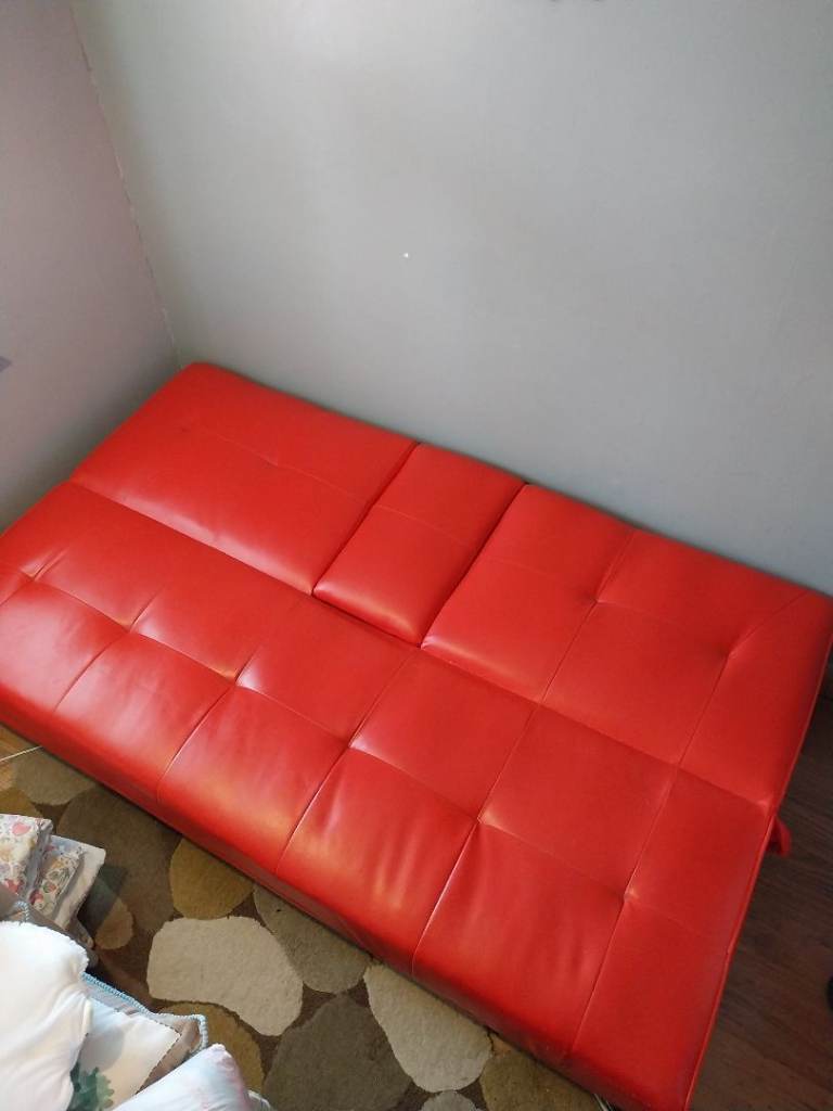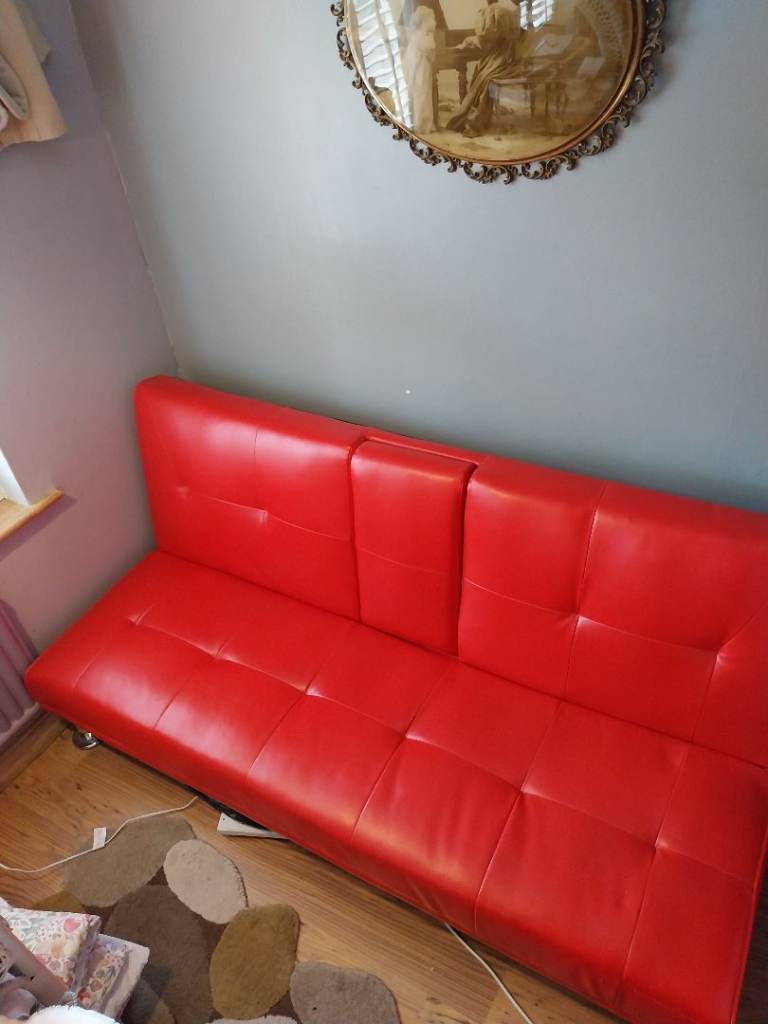 Retro looking click back sofa bed in red faux leather and chrome legs.