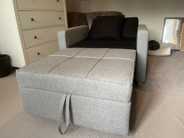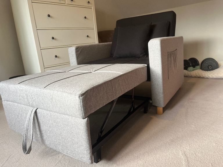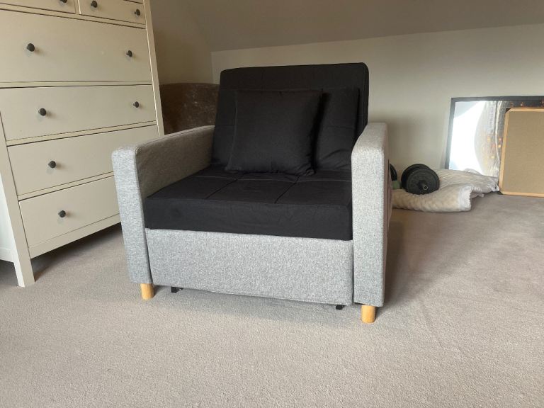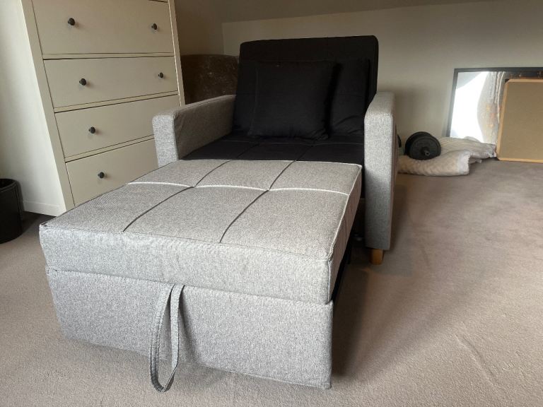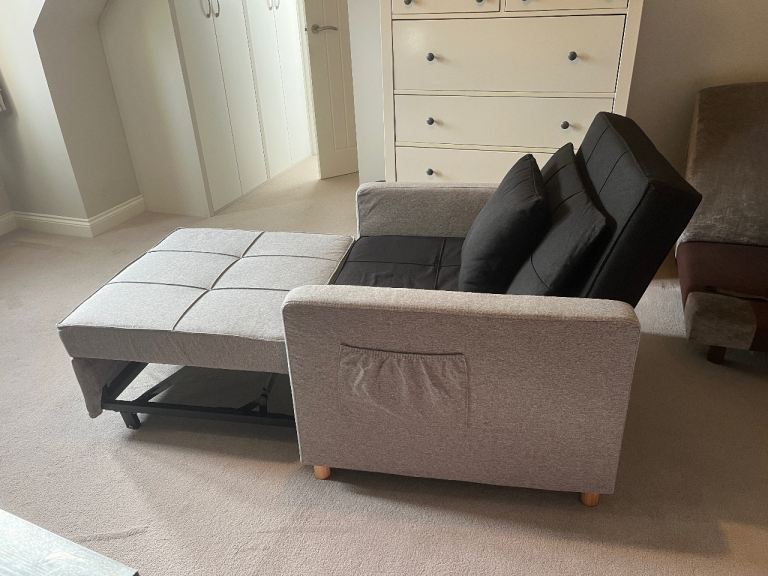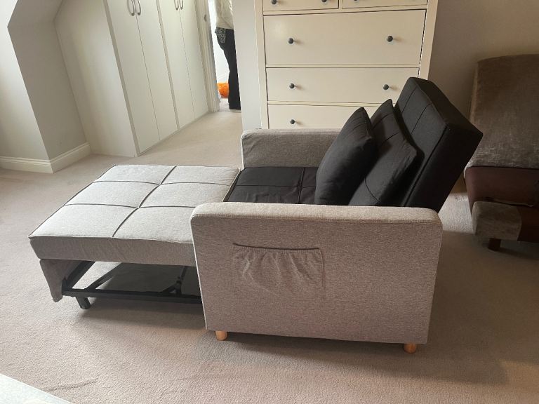 A pair of matching single seat sofa bed recliners. Black and grey upholstery.