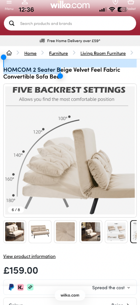 HOMCOM 2 Seater Beige Velvet Feel Fabric Convertible Sofa Bed.