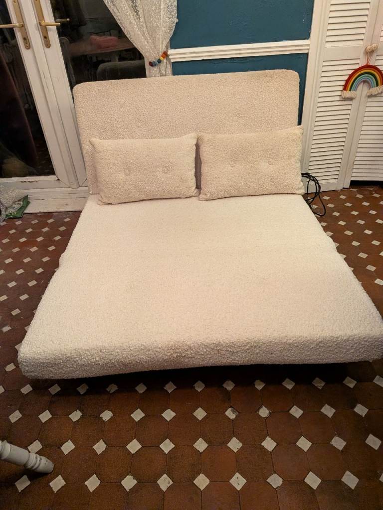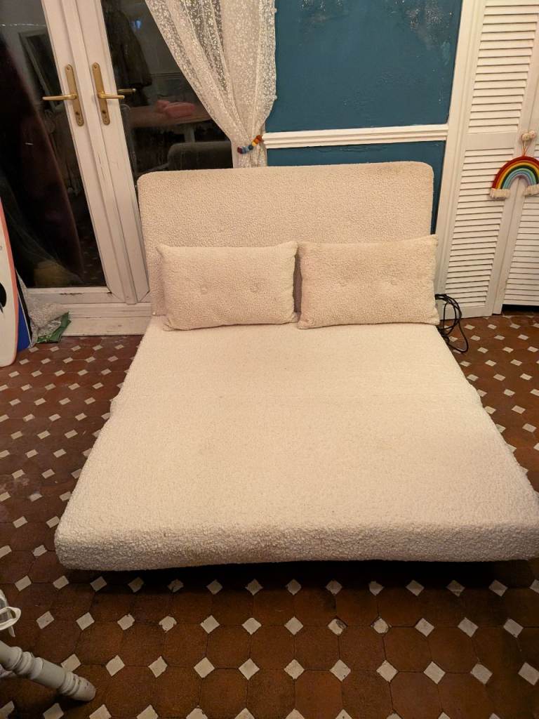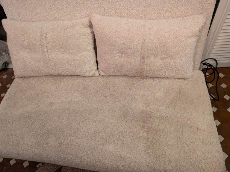 A beautiful 2 seater boucle cream sofa bed from Made. Good condition, however not as white as it was originally in places - don't think sofa cover removable but could be steam cleaned. Cushions included.