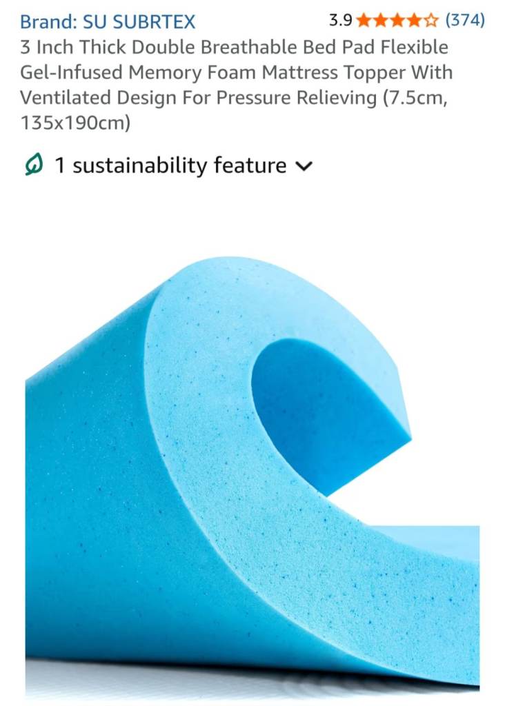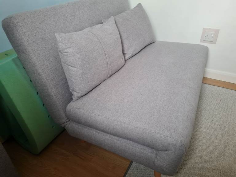 A grey, double, fold out sofa bed with 2 cushions. Comes with a foam topper (bought separately) for added comfort.