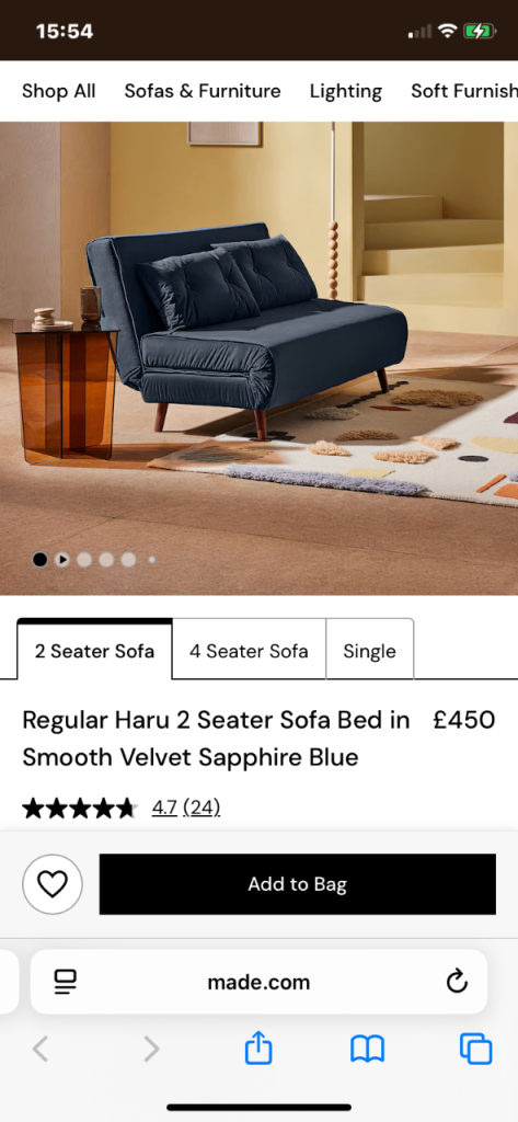 Bed length 185cm, bed width 118cm, bed height 45cm, full length with bed 223cm. Sofa width 170cm, sofa depth 85cm, sofa height 65cm.