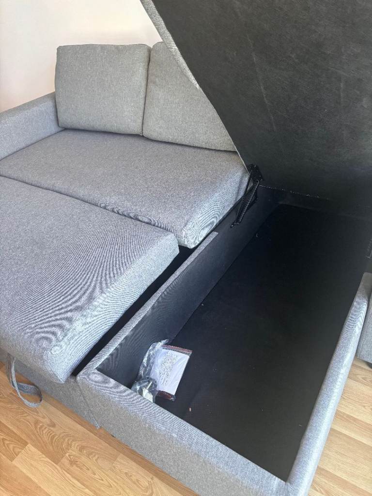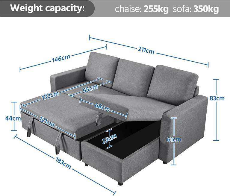 It easily converts into a double bed. The sofa also comes with 3 cushions. There are also deep storage compartments.