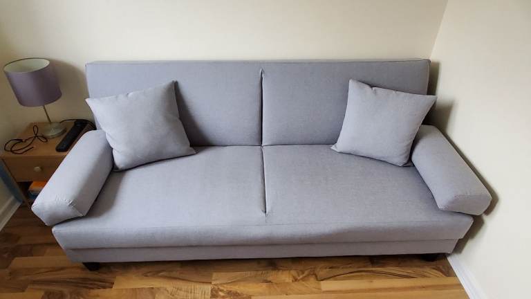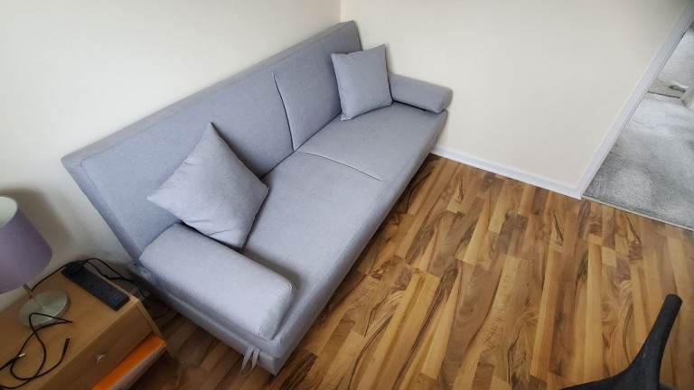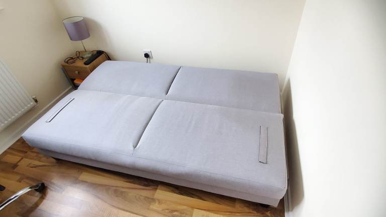 Sofa bed that has been used very little. Slight discolouration where the pillows and armrests have been (seen in unfolded pictures). Good for small bedroom or a guest room.