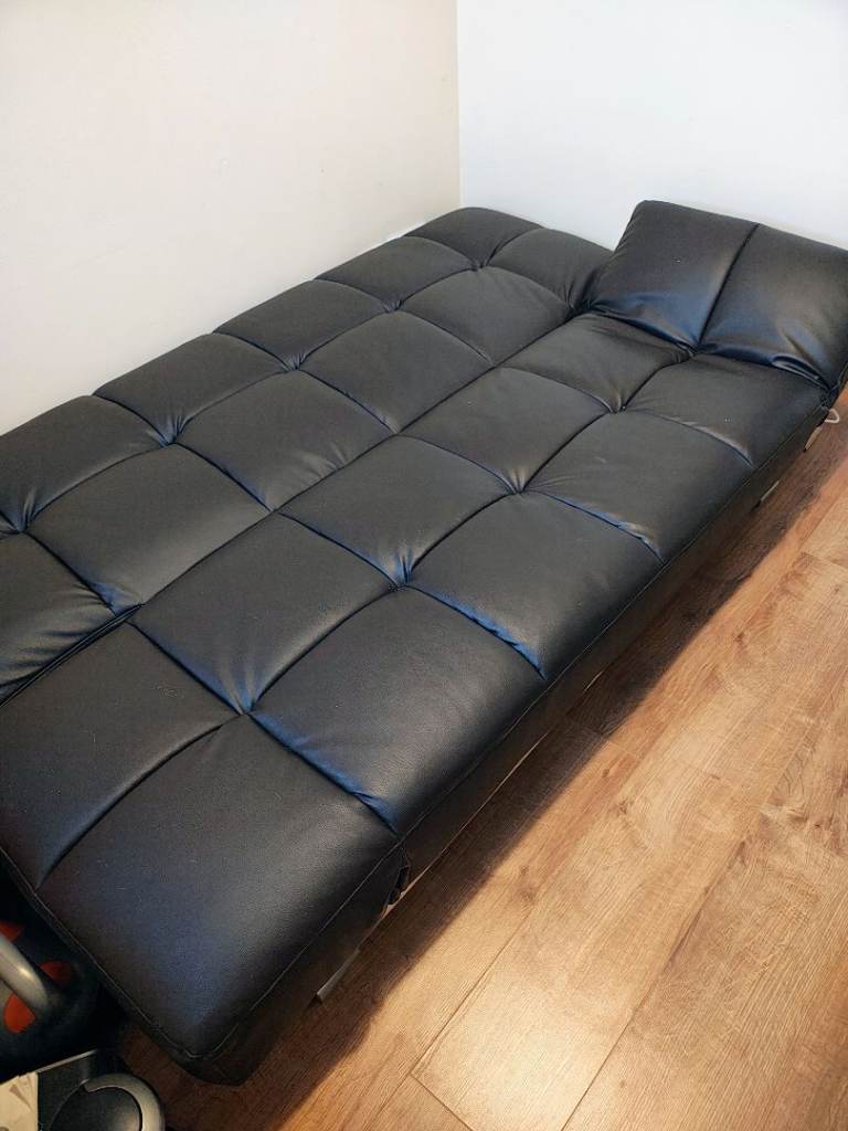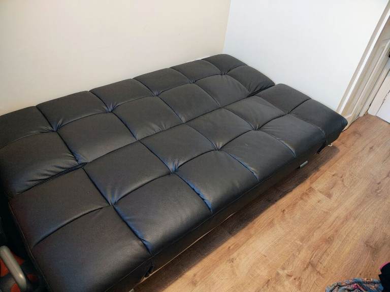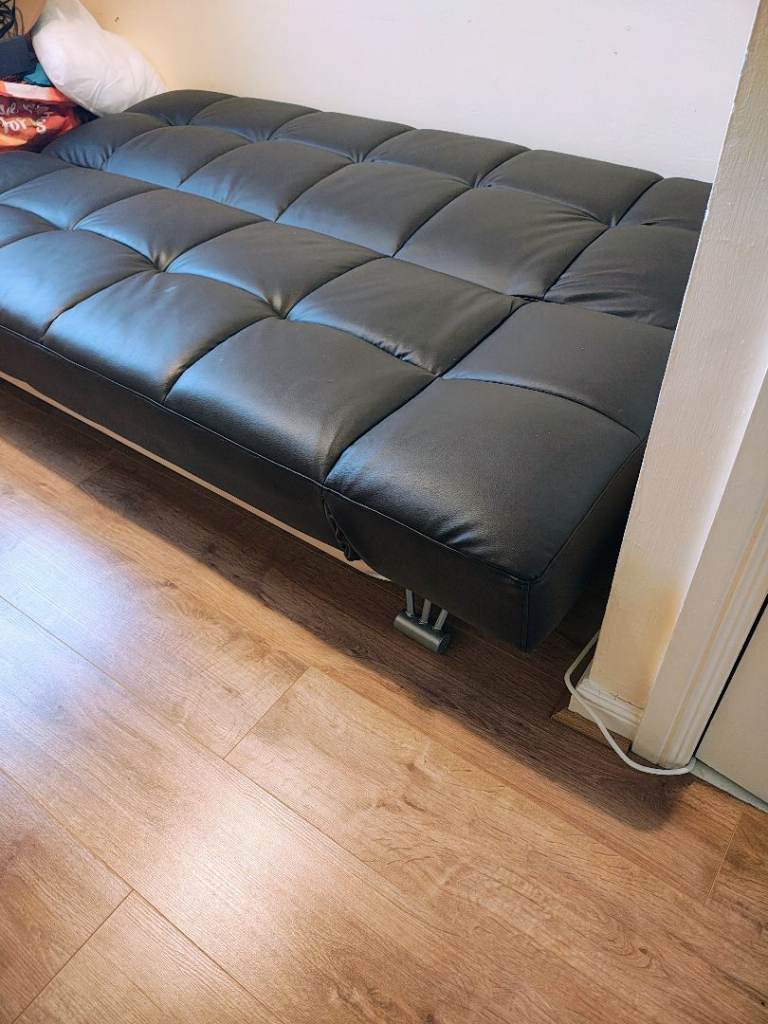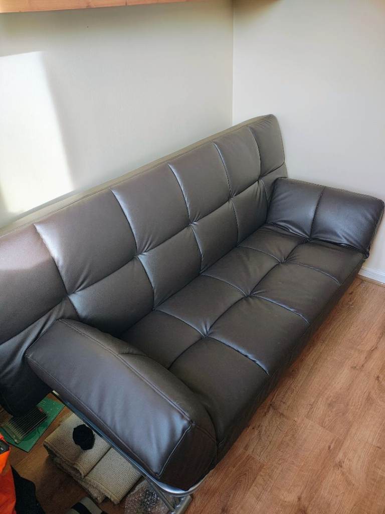 For sale is a quality brown feux leather sofa bed. Used occasionally, no tears or damage. Solid metal frame and material fire proof. Back and sides can be set at multiple angles from sofa to flat bed.