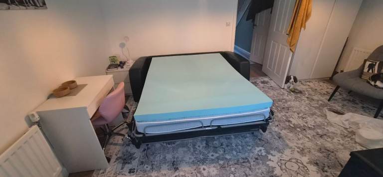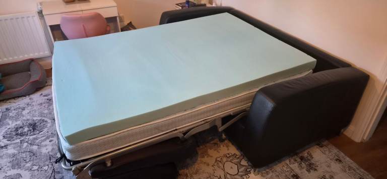 Sofa bed with mattress topper as it make it more comfortable. Used in good condition. Some signs of use but overall good.