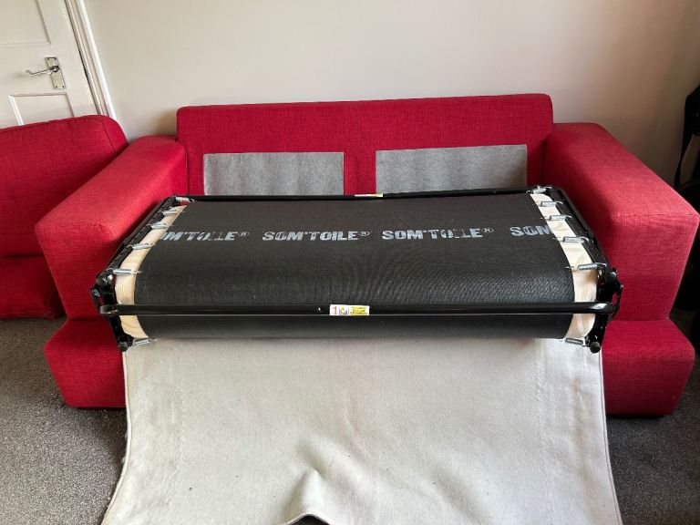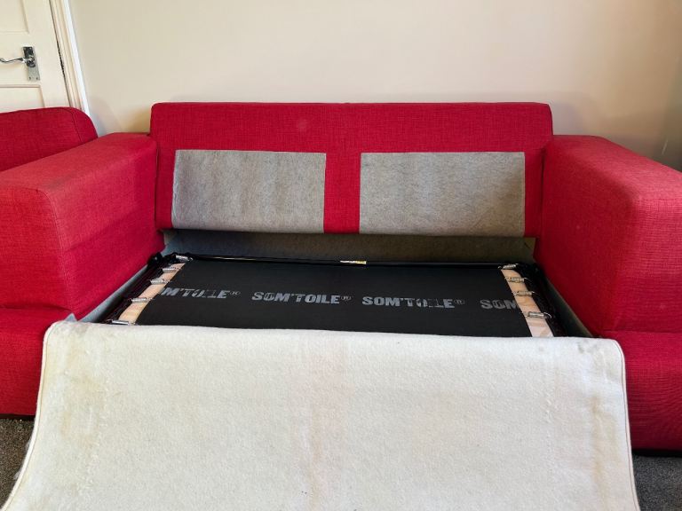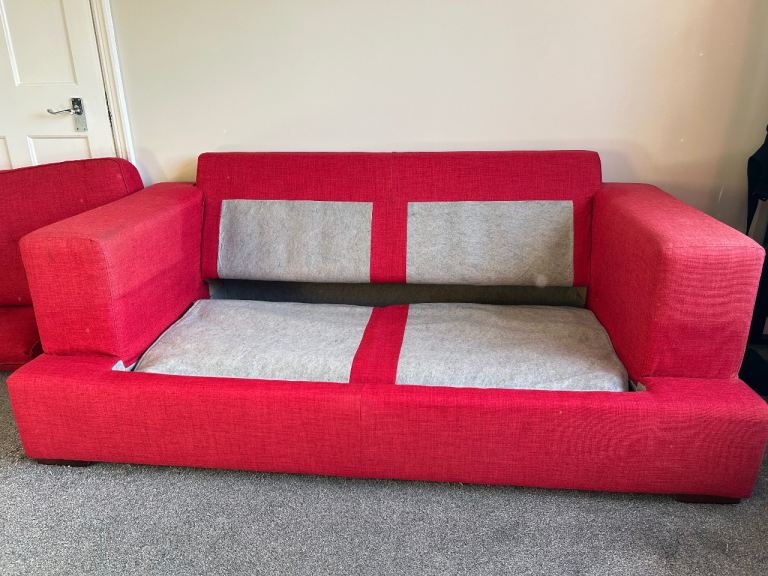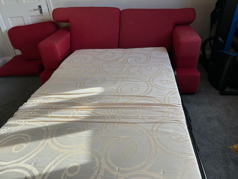 DFS sofa bed in red fabric with metallic fold out frame and mattress creating a small double bed - 116 x 180cm