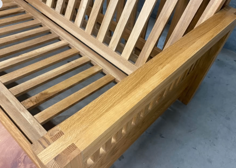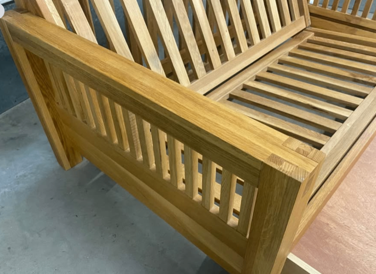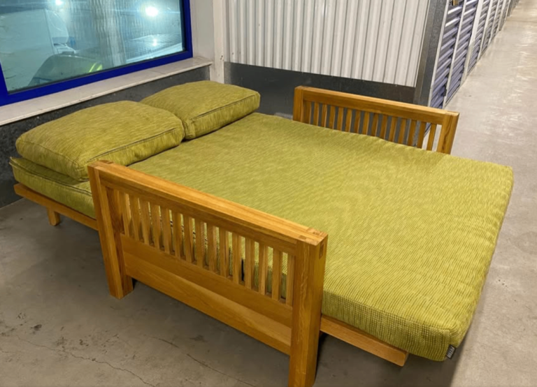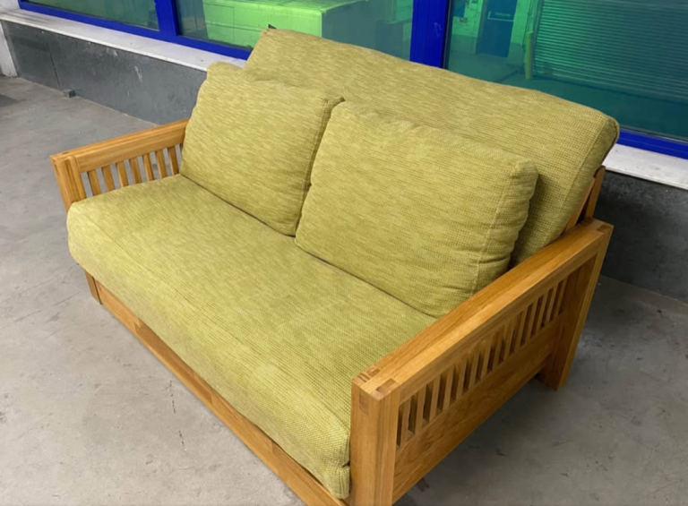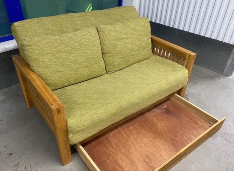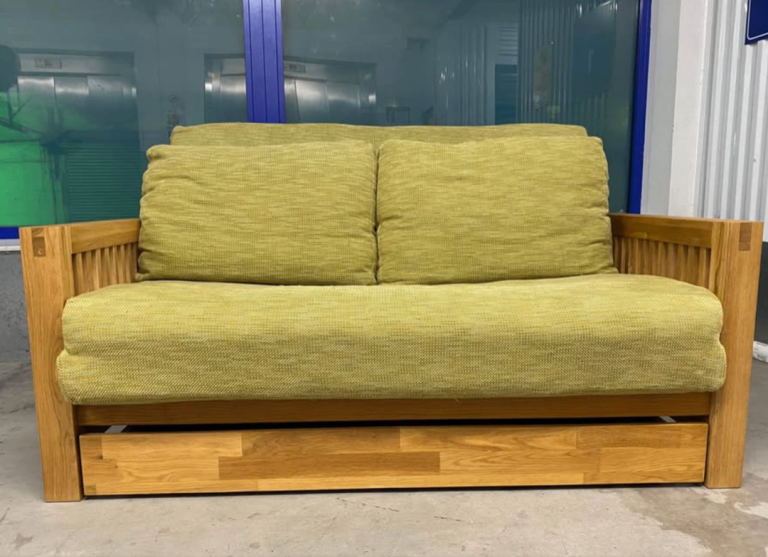 Solid Oak OKE range 2 Seater Futon Company Sofa Bed with under drawer and green armchair