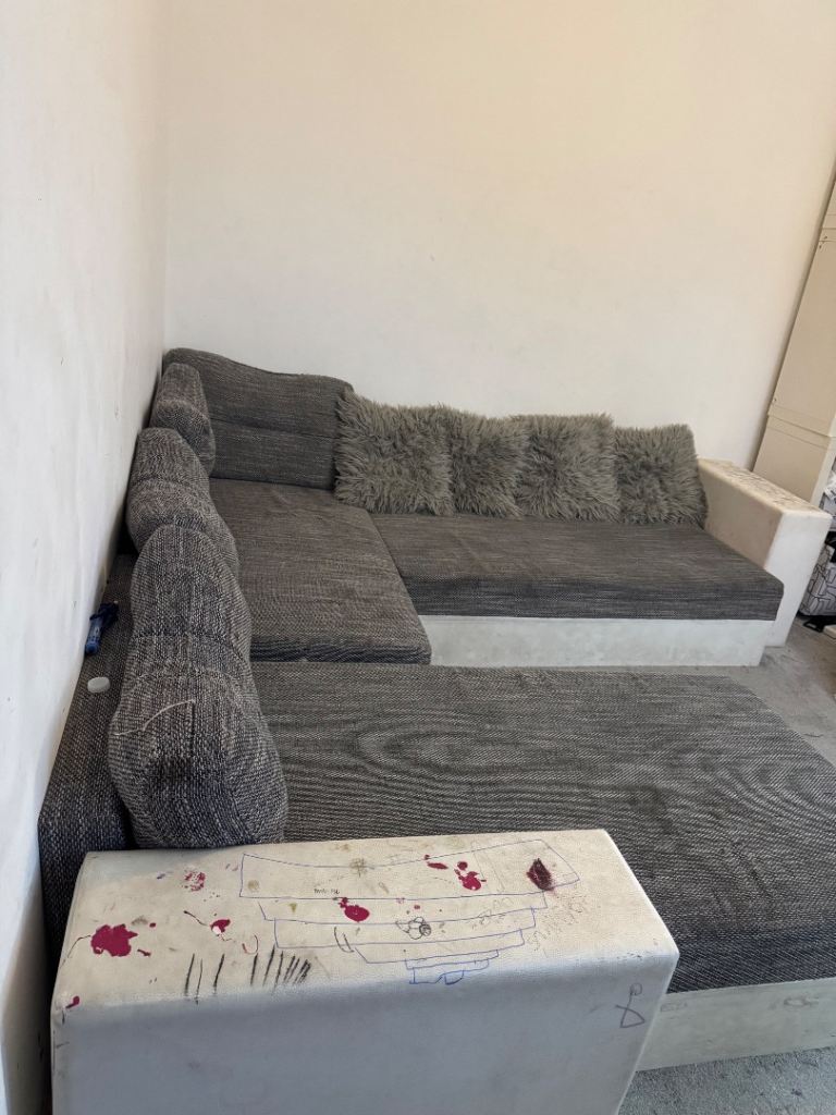 Sofa bed with a lot of storage inside it. Very durable. It’s best for someone who wants to do a DIY as my kids drew and painted on the leather part. Bought it from Wayfair 4 years back. It’s still got a lot of life in it. It’s just too big for my new apartment. Collection only pls.