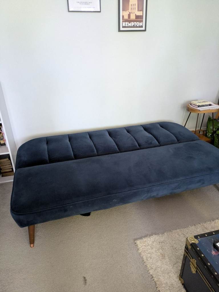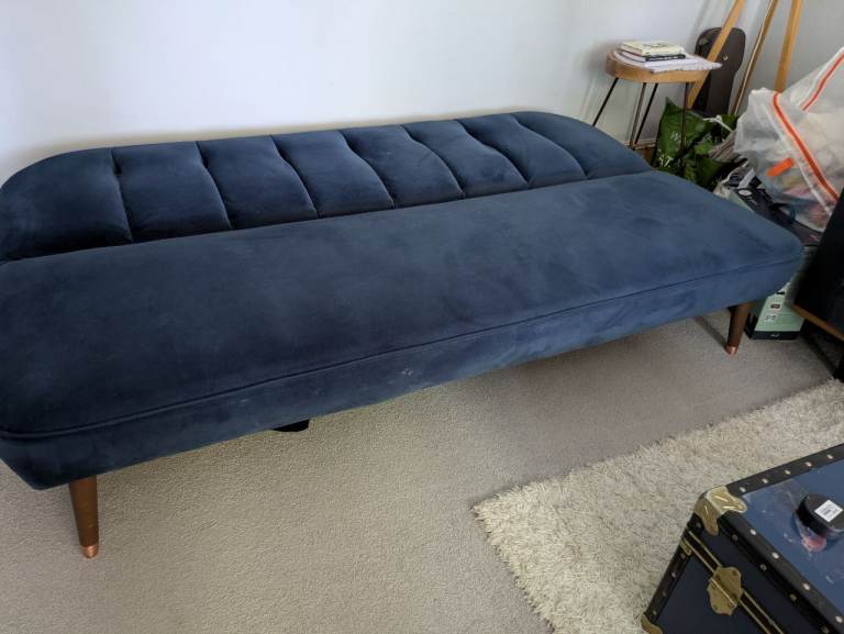 This is a stylish navy blue velvet clic-clac style sofabed from made dotcom in really good condition. Comfy to sit on and compact. Cushion not included!