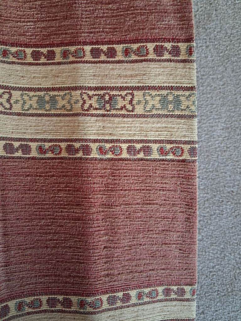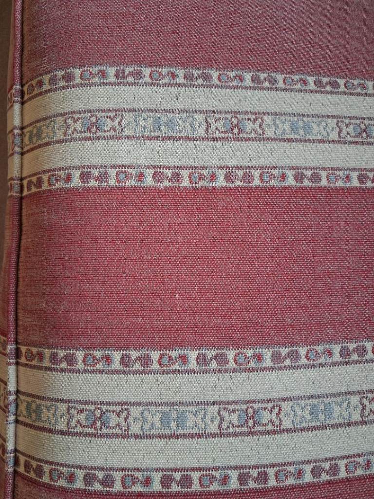 Dusky pink and cream with discreet, fine inset pattern in sage. Very fine (needle fine) chenille
