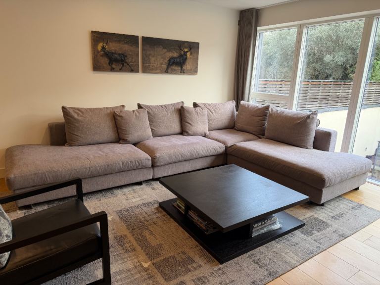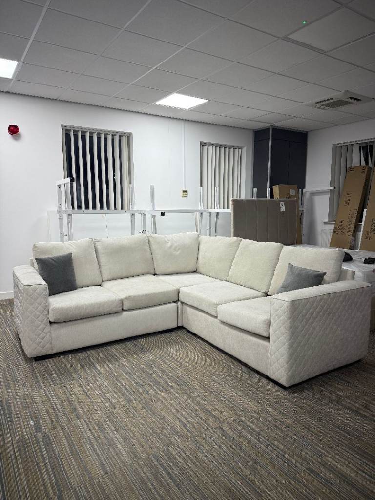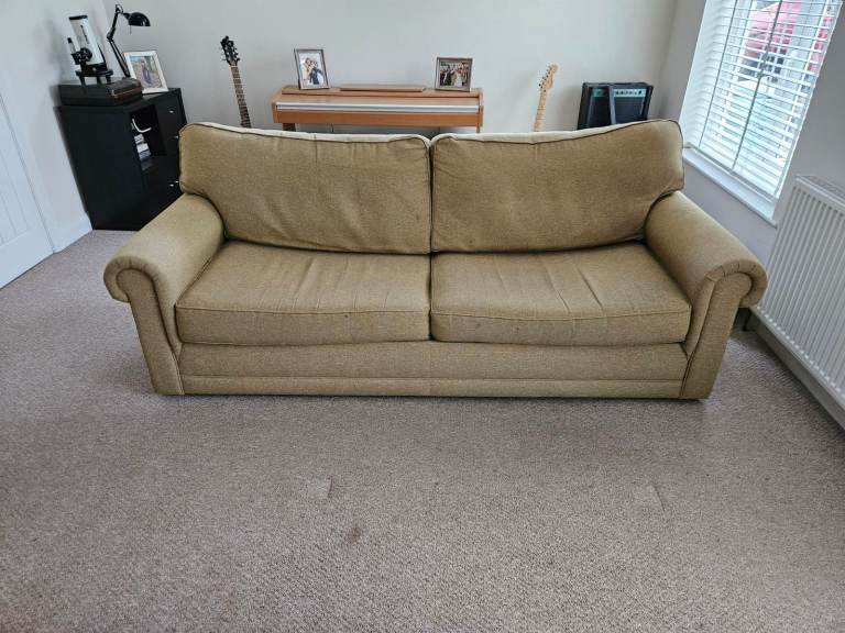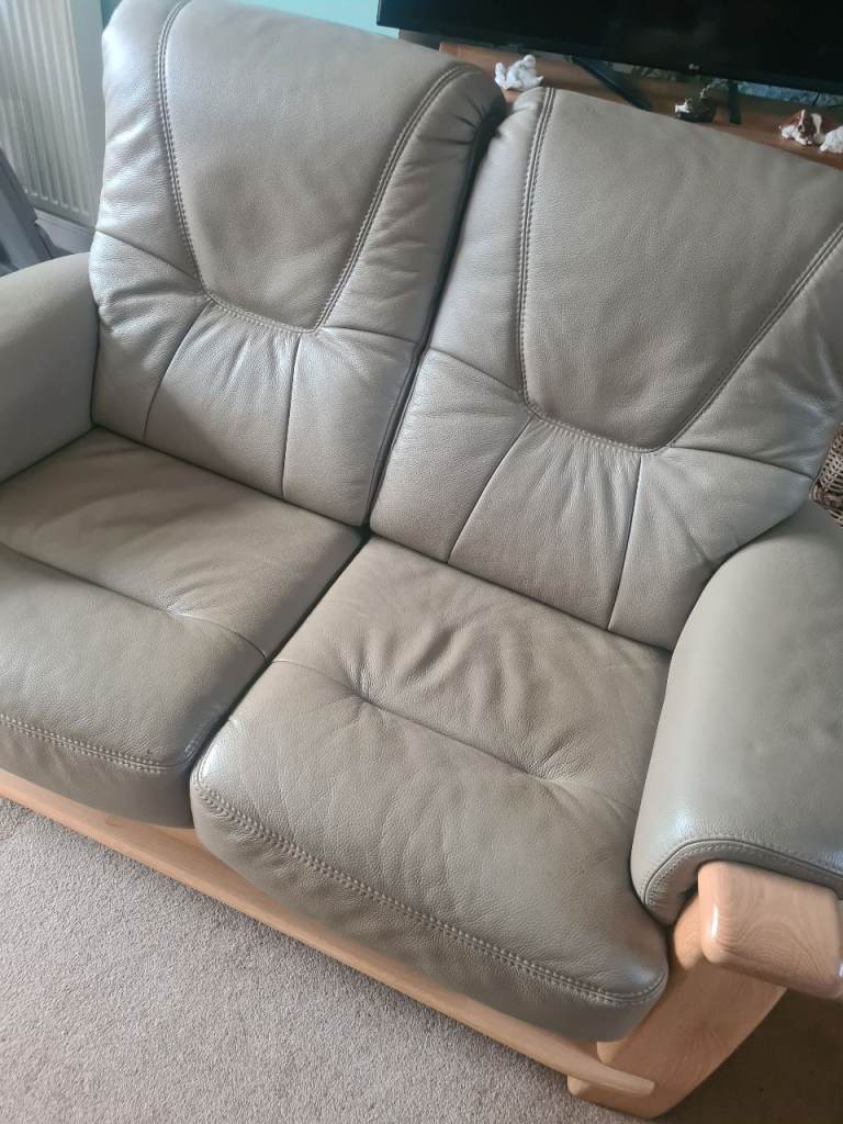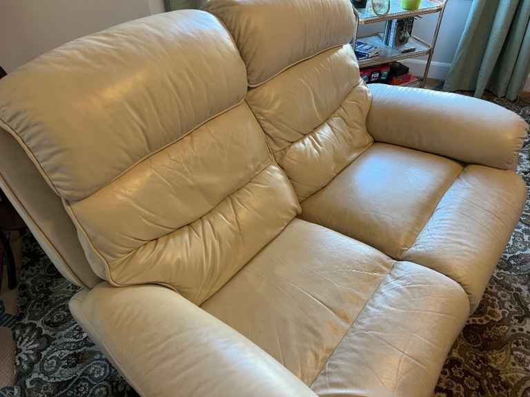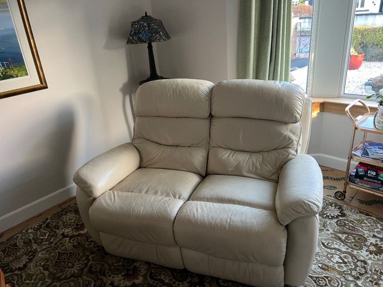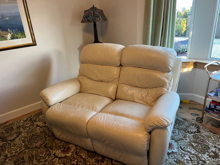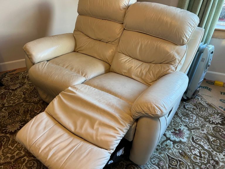 Cream leather two seater sofa, purchased from Sterlings. Double manual recliner, in good condition with no damage or repairs. Originally part of a suite we bought from Sterlings which at that time was over £5k. We have just ordered a new corner group and new flooring, so need to sell quickly.