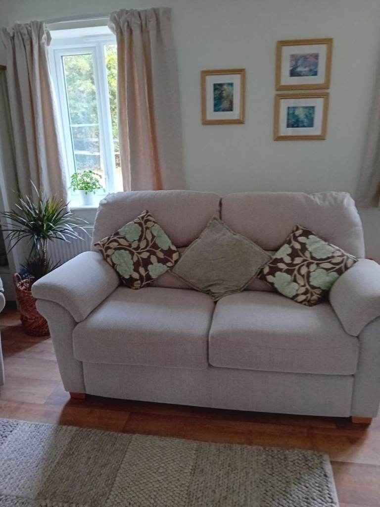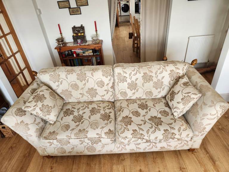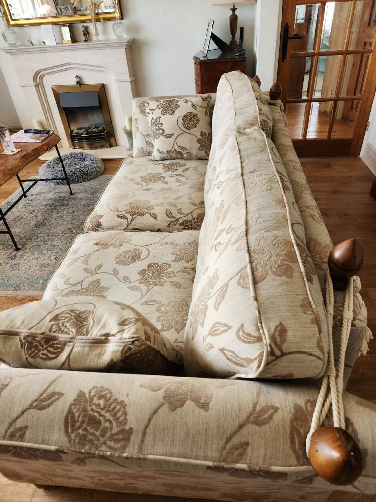 Knole sofa. Traditional sofa with wooden finials and tiebacks. In very good condition. With drop down ends. It has 2 large cusions to seat 3 people.