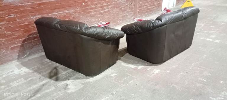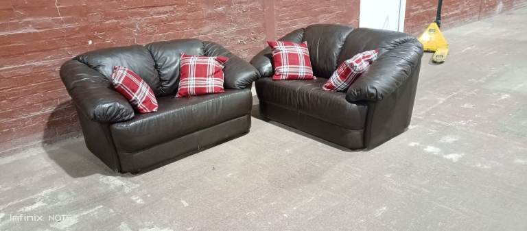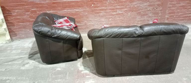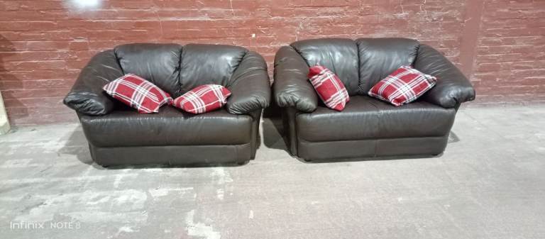 This is a used Two and two Seater Brown genuine Leather Sofa with 4 Cushions in excellent condition.