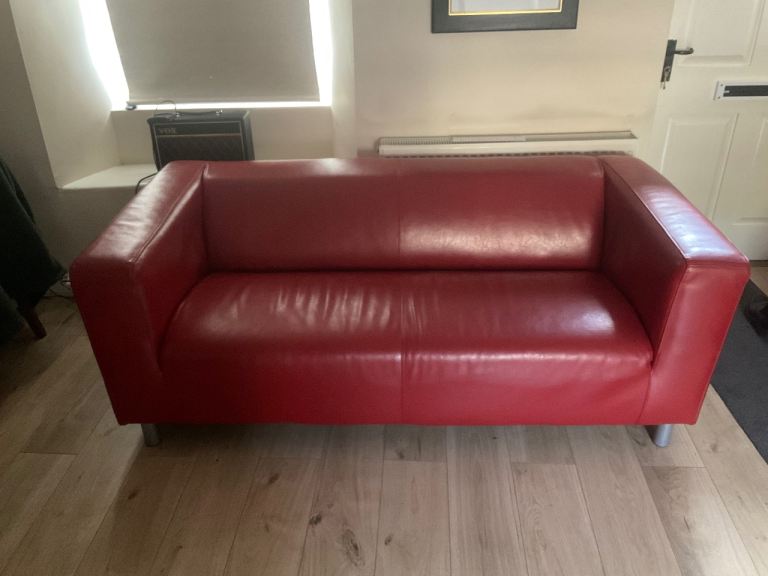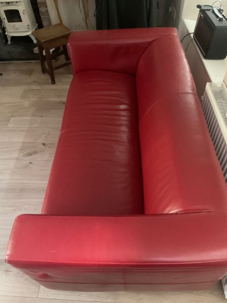 2 seater red leather sofa 180cm wide X 87cm deep X 66cm high