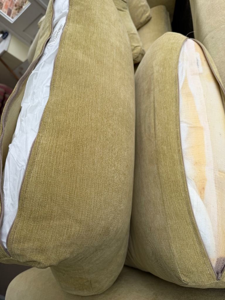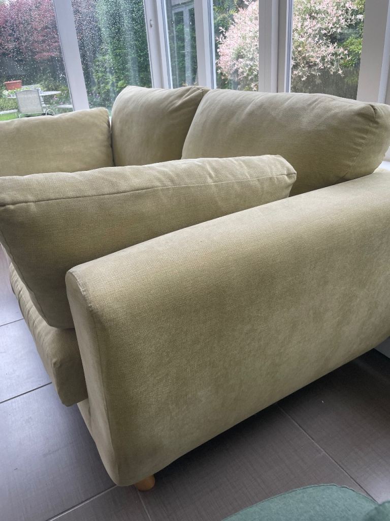 2 seater sofa in a Lemon cloth. Ideal for a conservatory or playroom. A little faded, but really solid and really comfortable from a good quality British maker. All zipped cushions removable for washing/dry cleaning. Hardwood feet.