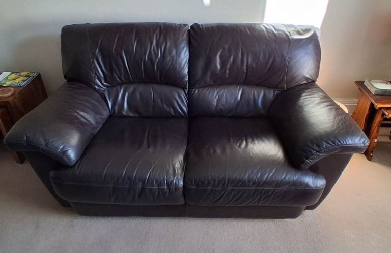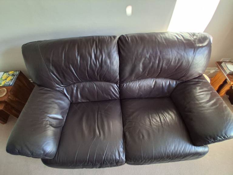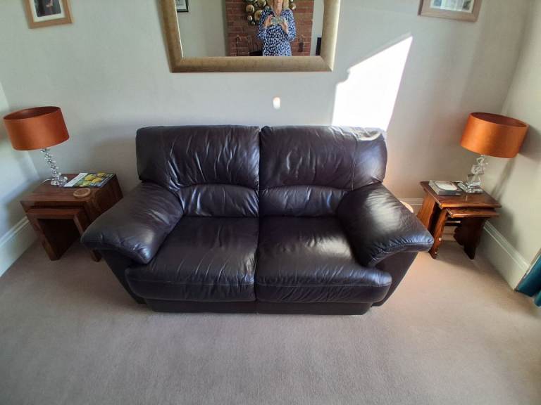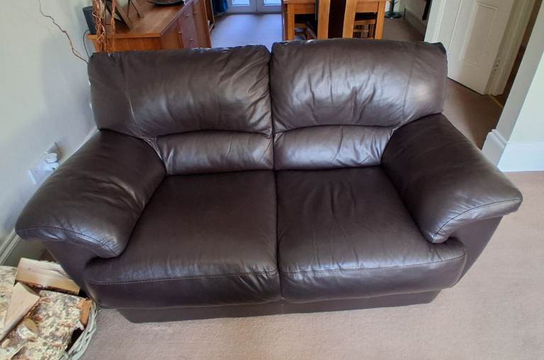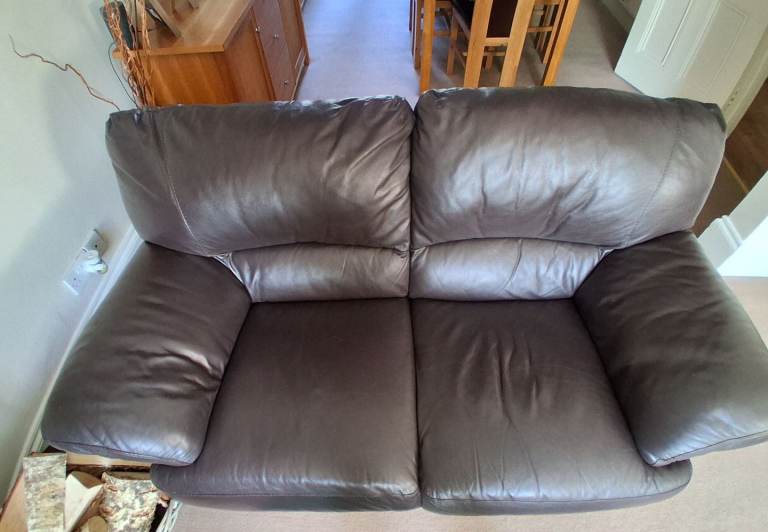 Two chocolate brown leather sofas. About 18 years old, so showing some signs of wear and tear, but have been very well looked after, in fantastic condition for their age and are comfortable. Would suit a smaller living room.