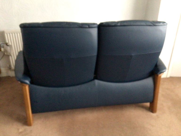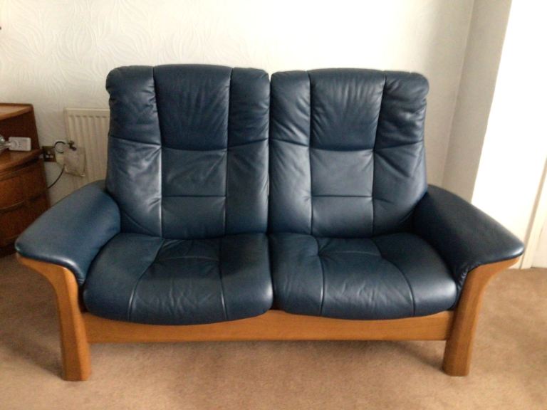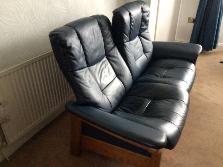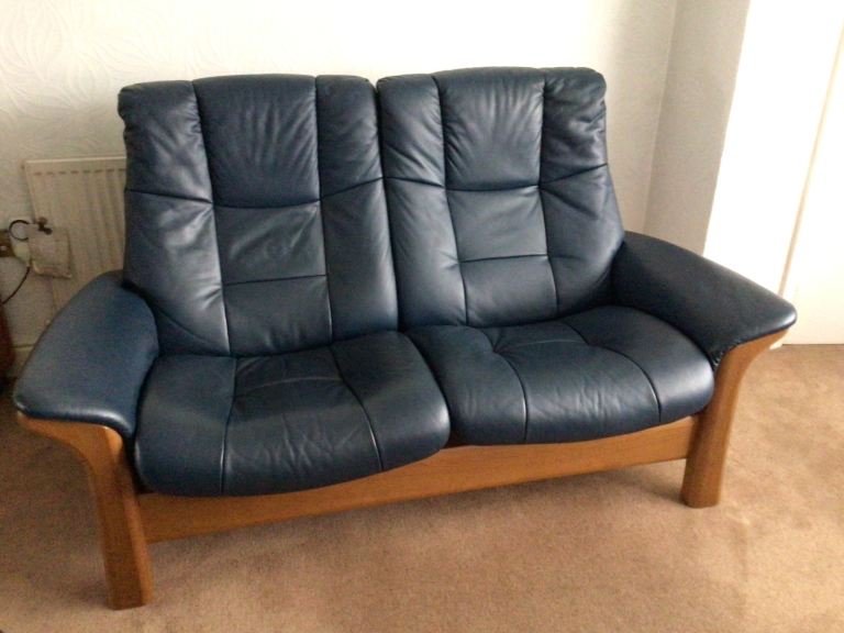 2 x Navy blue, two seater leather sofas by Stressless, Buckingham model.