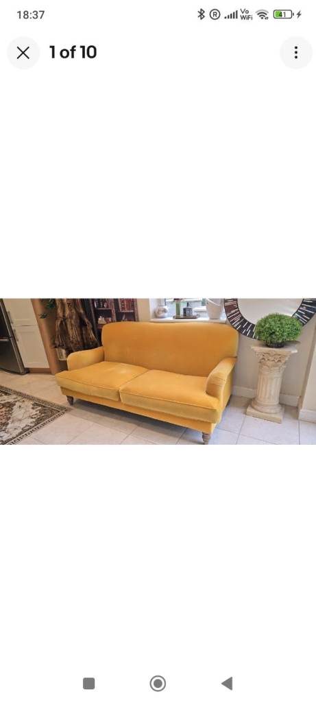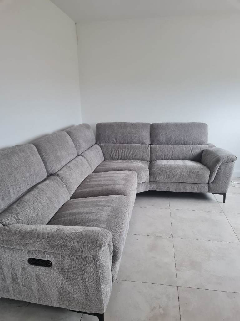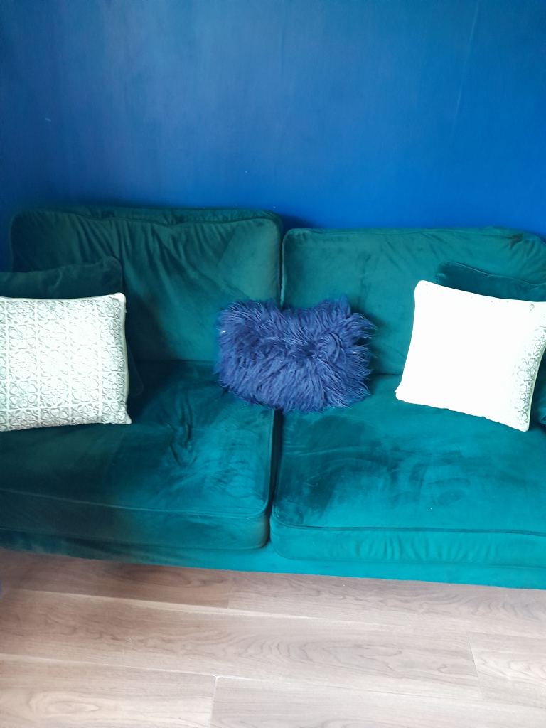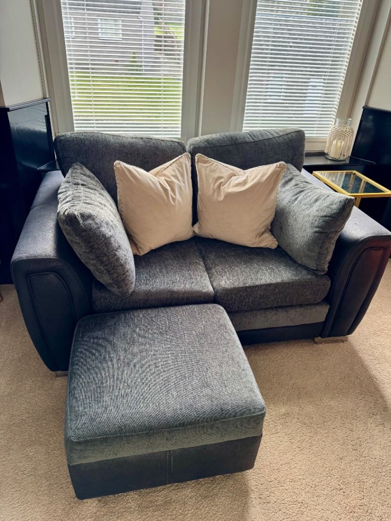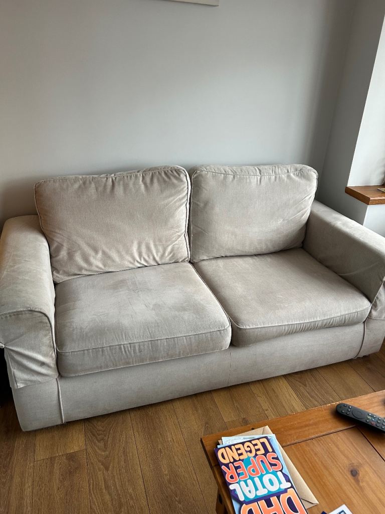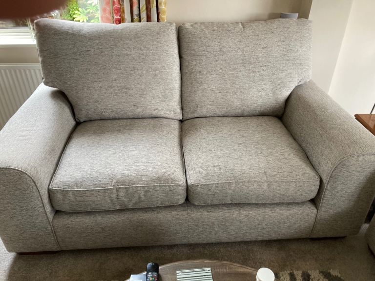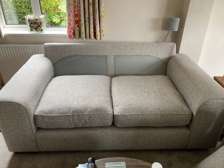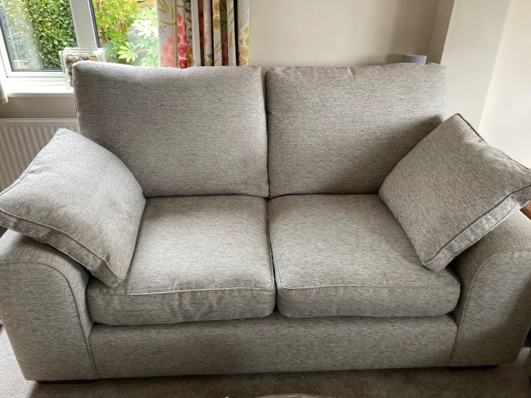2 very comfortable light grey tweed sofas. Both in excellent condition ( no pets or children). Each measures 1800mm wide x 940 mm deep x 980 mm high. With cushions removed back height reduced to 720 mm for easy access through standard door frame. Optional wing cushions included for extra comfort. All cushions covers are removable for easy cleaning.