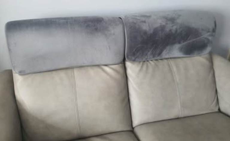 * The headrests on the 2-seater peeled pretty badly. Our solution? We securely attached grey velour, memory-foam-backed bath mats to the headrests. I know, it sounds absolutely unhinged—but look at the photos! It actually blends in well, looks way better than peeling leather, and is ridiculously comfy to lean back on.