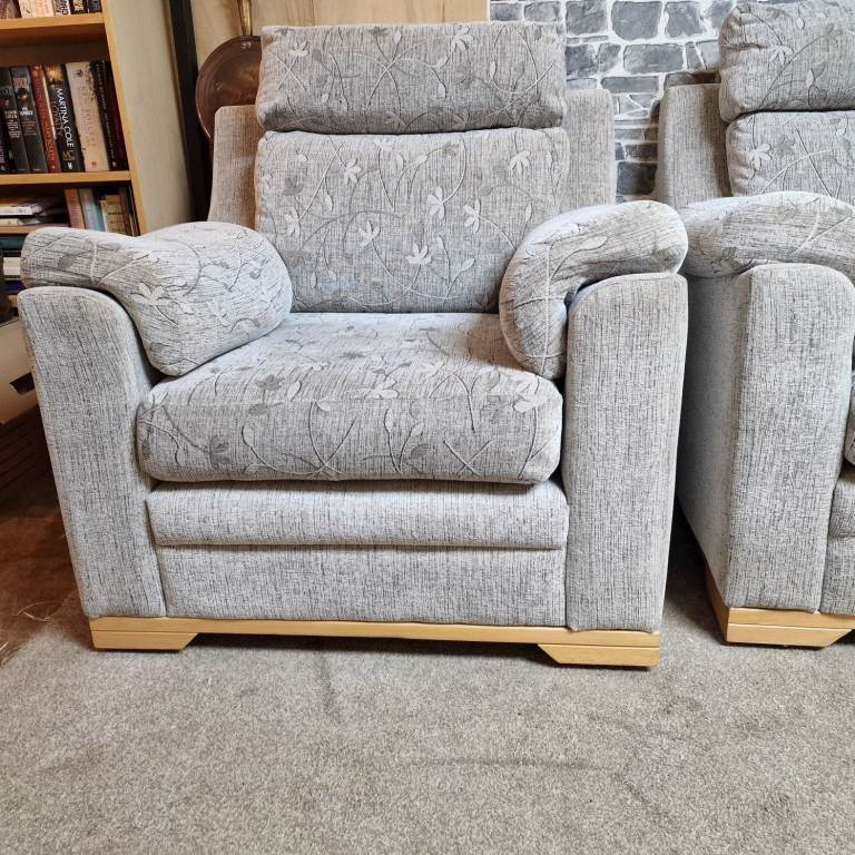 Comfortable and elegant 3-piece sofa suite upholstered in soft light grey patterned fabric. The set includes one 2-seater sofa and two matching armchairs, each with plush cushions and supportive armrests. The subtle floral pattern and light wood base give the suite a timeless, neutral look that fits beautifully into any living space.