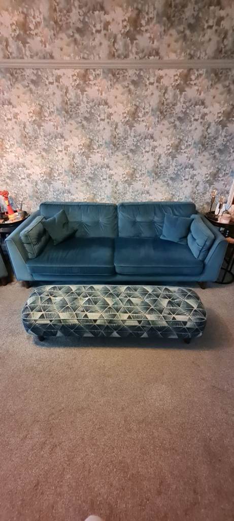Bonus: The striking patterned ottoman is included and perfectly complements the teal velvet.