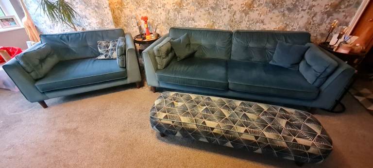 Elevate your living space with this beautiful, complete three-piece seating arrangement from Sofology. This set includes the spacious 3-Seater Sofa, the cosy Snuggle/Cuddle Chair (sometimes called a Love Seat), and a stylish Matching Ottoman/Footstool.