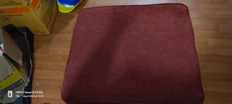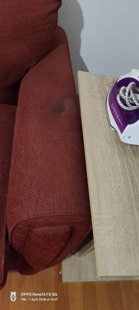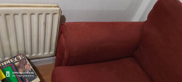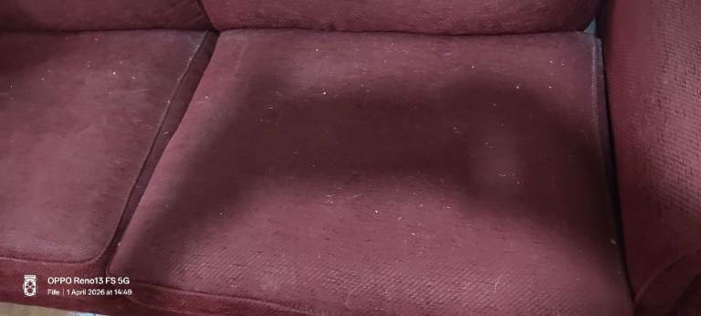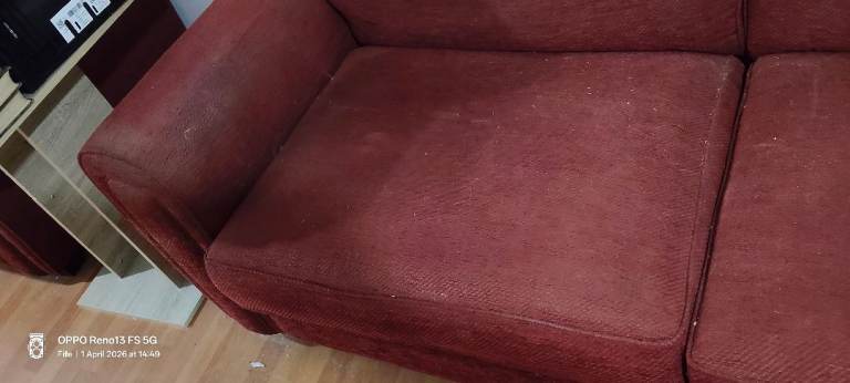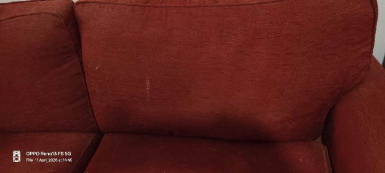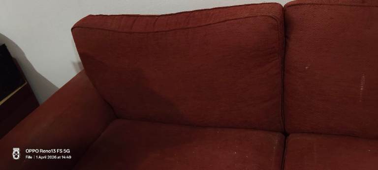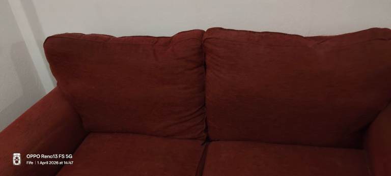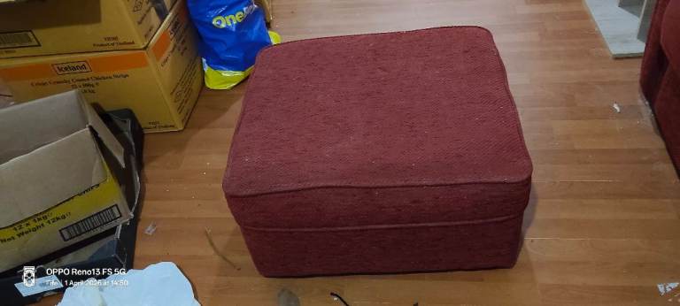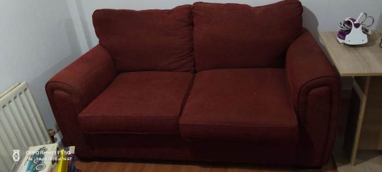 Large 2 seater that comfortably would sit 3. 2 seater couch and a large foot pouffe.