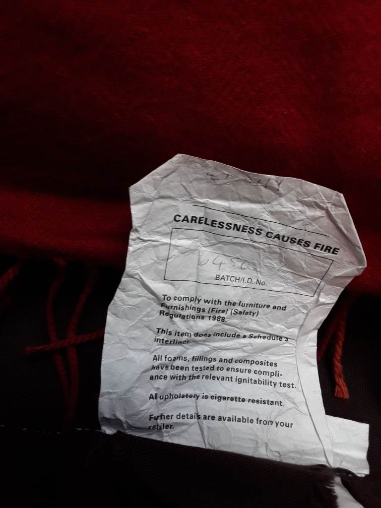 Removable covers unzip to come off to be washed. Has been in a non-smoking no-pet family since new. Although of the same "set", not all have a "safety" label attached.