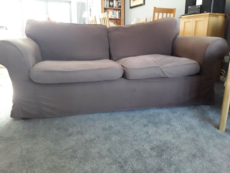 Brown 3 seater settee, chaie and pouffe. Comfy, but faded a bit.