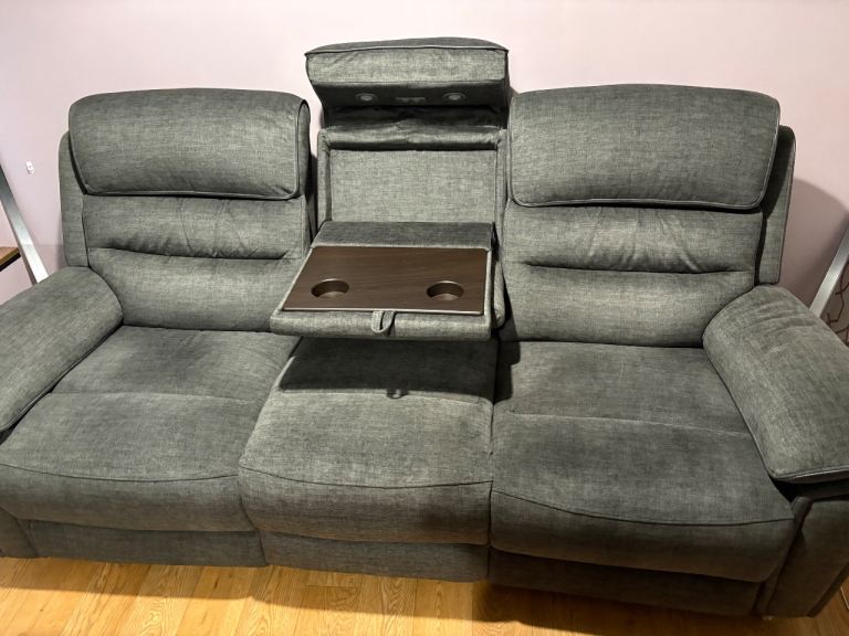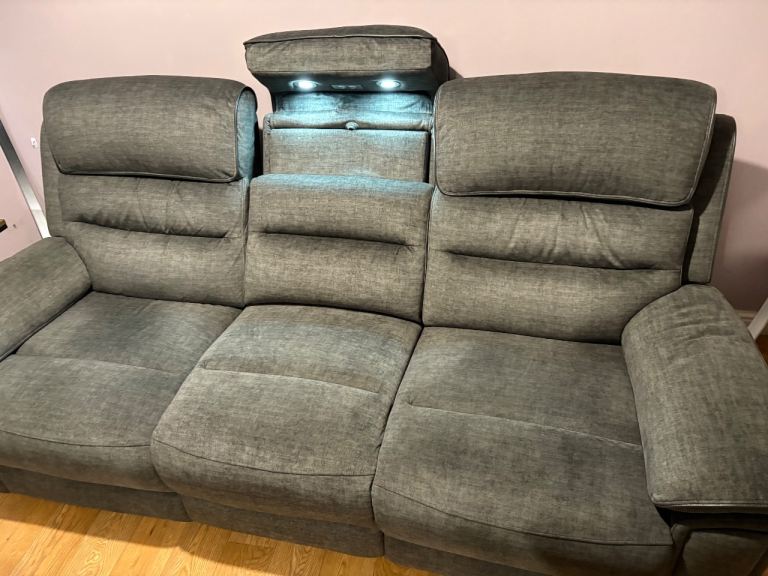 3 seater fabric sofa with electric recliners. 2 UBS ports. The centre can be folded down into a console with 2 cup holders and 2 movable reading lights.