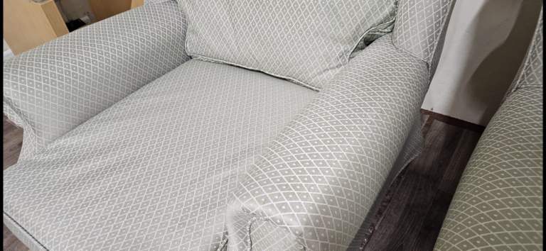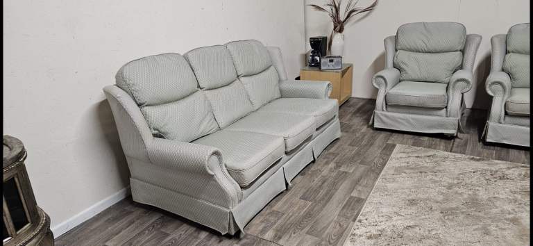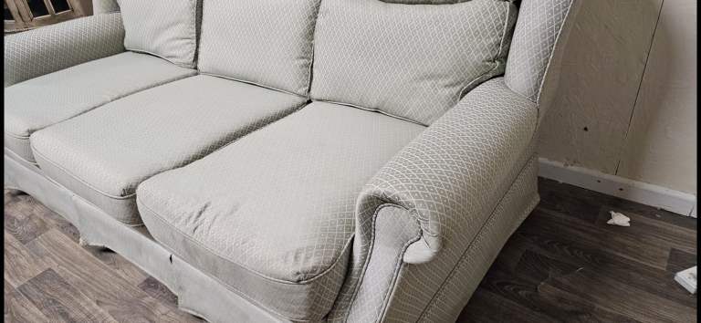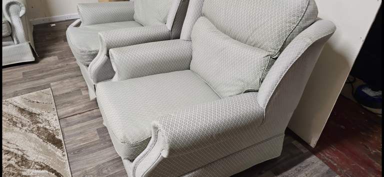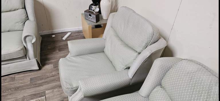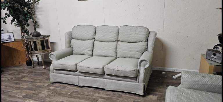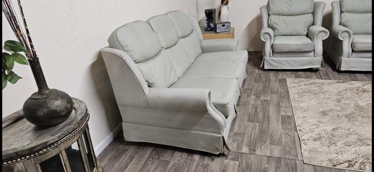 3 Seater sofa + 2 armchairs. Good condition. No rips or tears. On castor wheels. Scroll armrests, Wingback sides. All seats are fine to use. Viewing welcome. Collection welcome. Delivery may be possible.