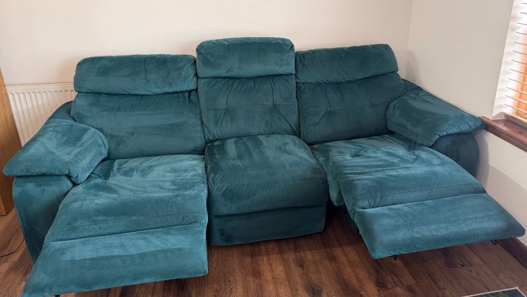 Selling my teal 3-seater recliner sofa in great condition. Super comfy with reclining seats, perfect for relaxing and movie nights. Only selling due to redecorating. Please note: collection will be available at the end of May. I also have a matching round footstool listed in a separate advert if you’re interested. Message me for more details!