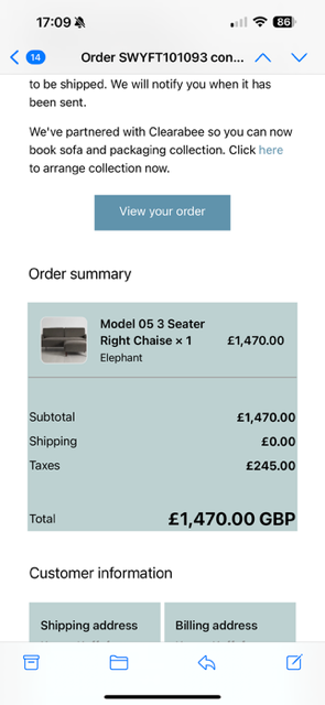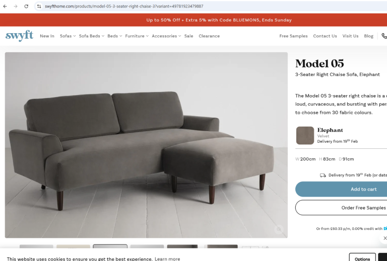 3 seater sofa with footstool. The exact model is ( Swyft Home Model 5, 3-seater with right chaise - one of the pictures is from their current website) . The colour is 'elephant', which is a nice grey. The fabric feels like velvet, but it really is Polyester. I purchased it in April 2022 for £1,470, and has been used very little. I just wanted a different style. Collection only. Cushions not included. One of the pictures shows the exact measurements.